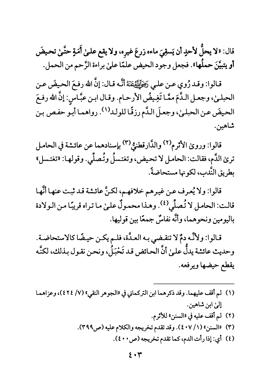قالوا: وقد رُوي عن علي - رضي الله عنه - أنَّه قال: إنَّ الله رفعَ الحيضَ عن الحبلى، وجعل الدَّمَ ممَّا تَغِيضُ الأرحام. وقال ابن عبَّاسٍ: إنَّ الله رفعَ الحيضَ عن الحبلى، وجعلَ الدَّم رزقًا للولد (¬١). رواهما أبو حفص بن شاهين.