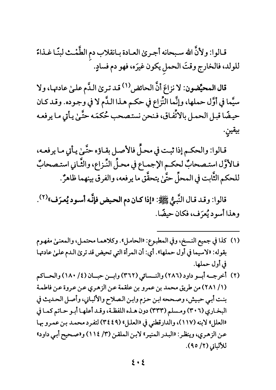 (¬١) كذا في جميع النسخ، وفي المطبوع: «الحامل». وكلاهما محتمل، والمعنى مفهوم بقوله: «لاسيما في أول حملها». أي: أن المرأة التي تحيض قد ترى الدم على عادتها في أول حملها.