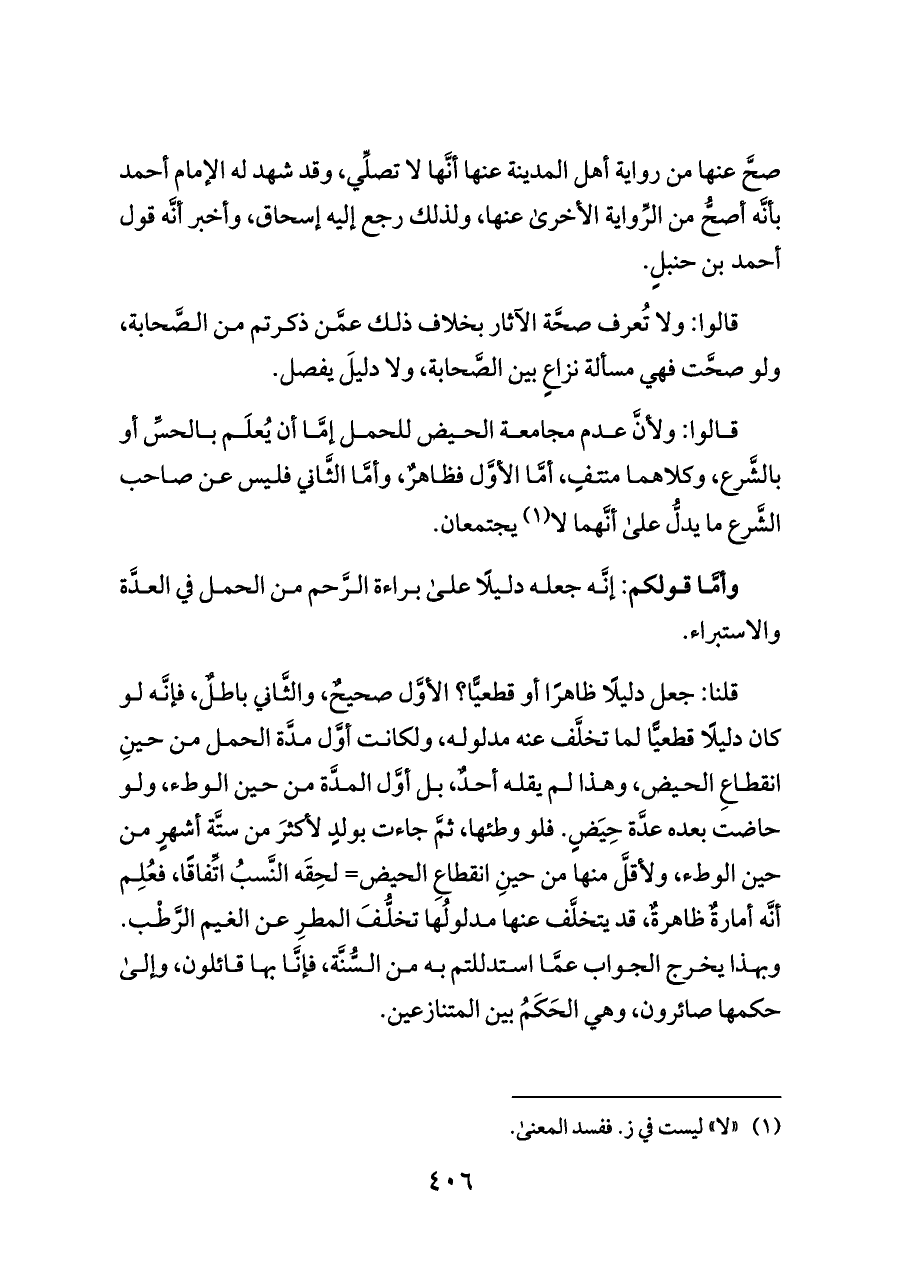 قلنا: جعل دليلًا ظاهرًا أو قطعيًّا؟ الأوَّل صحيحٌ، والثَّاني باطلٌ، فإنَّه لو كان دليلًا قطعيًّا لما تخلَّف عنه مدلوله، ولكانت أوَّل مدَّة الحمل من حينِ انقطاعِ الحيض، وهذا لم يقله أحدٌ، بل أوَّل المدَّة من حين الوطء، ولو حاضت بعده عدَّة حِيَضٍ. فلو وطئها، ثمَّ جاءت بولدٍ لأكثرَ من ستَّة أشهرٍ من حين الوطء، ولأقلَّ منها من حينِ انقطاعِ الحيض= لحِقَه النَّسبُ اتِّفاقًا، فعُلِم أنَّه أمارةٌ ظاهرةٌ، قد يتخلَّف عنها مدلولُها تخلُّفَ المطرِ عن الغيم الرَّطْب. وبهذا يخرج الجواب عمَّا استدللتم به من السُّنَّة، فإنَّا بها قائلون، وإلى حكمها صائرون، وهي الحَكَمُ بين المتنازعين.