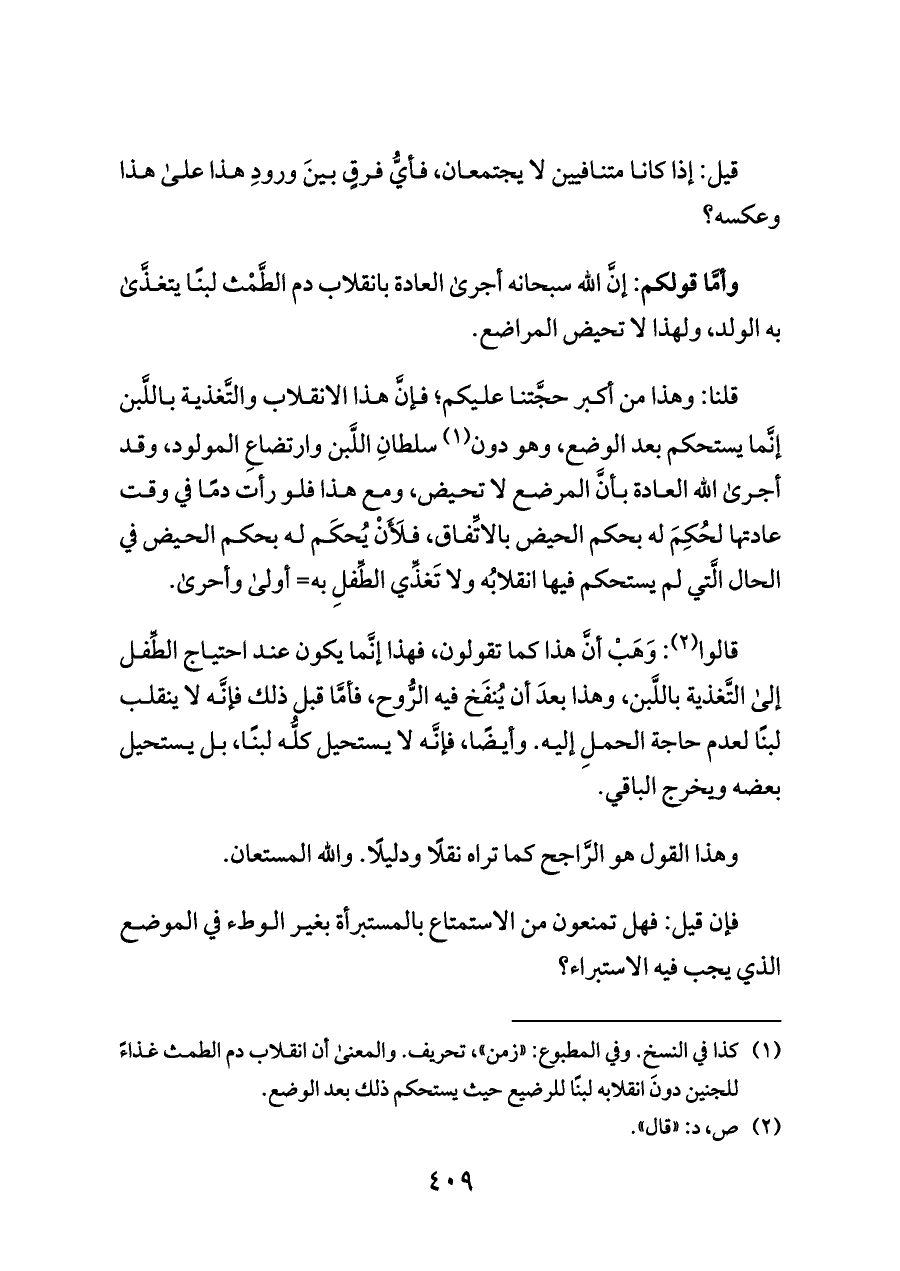 وأمَّا قولكم: إنَّ الله سبحانه أجرى العادة بانقلاب دم الطَّمْث لبنًا يتغذَّى به الولد، ولهذا لا تحيض المراضع.