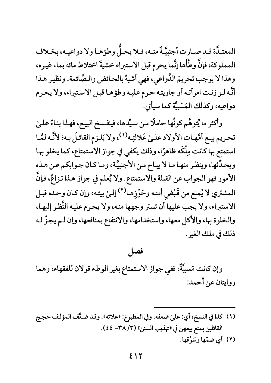 وأكثر ما يُتوهَّم كونُها حاملًا من سيِّدها، فينفسخ البيع، فهذا بناءً على تحريم بيع أمَّهات الأولاد على عَلالتِه (¬١)، ولا يَلزم القائلَ به؛ لأنَّه لمَّا استمتع بها كانت مِلْكَه ظاهرًا، وذلك يكفي في جواز الاستمتاع، كما يخلو بها ويحدِّثها، وينظر منها ما لا يباح من الأجنبيَّة، وما كان جوابكم عن هذه الأمور فهو الجواب عن القبلة والاستمتاع. ولا يُعلم في جواز هذا نزاعٌ، فإنَّ المشتري لا يُمنع من قَبْضِ أمته وحَوْزِها (¬٢) إلى بيته، وإن كان وحده قبل الاستبراء، ولا يجب عليها أن تستر وجهها منه، ولا يحرم عليه النَّظر إليها، والخلوة بها، والأكل معها، واستخدامها، والانتفاع بمنافعها، وإن لم يجزْ له ذلك في ملك الغير.