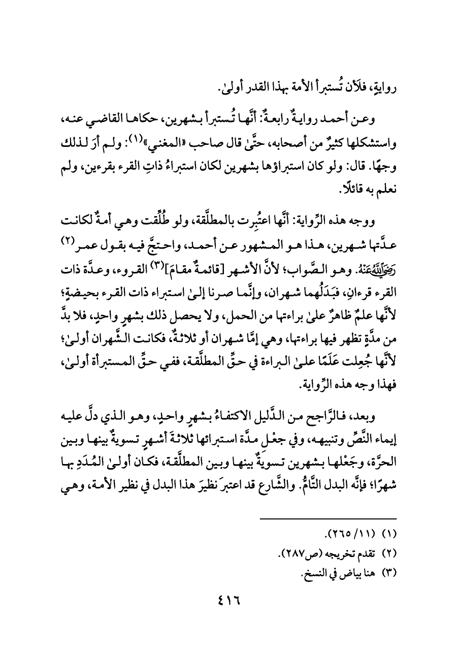 ووجه هذه الرِّواية: أنَّها اعتُبِرت بالمطلَّقة، ولو طُلِّقت وهي أمةٌ لكانت عدَّتها شهرين، هذا هو المشهور عن أحمد، واحتجَّ فيه بقول عمر (¬٢) - رضي الله عنه -. وهو الصَّواب؛ لأنَّ الأشهر [قائمةٌ مقامَ] (¬٣) القروء، وعدَّة ذات القرء قرءانِ، فبَدَلُهما شهران، وإنَّما صرنا إلى استبراء ذات القرء بحيضةٍ؛ لأنَّها علمٌ ظاهرٌ على براءتها من الحمل، ولا يحصل ذلك بشهرٍ واحدٍ، فلا بدَّ من مدَّةٍ تظهر فيها براءتها، وهي إمَّا شهران أو ثلاثةٌ، فكانت الشَّهران أولى؛ لأنَّها جُعِلت عَلَمًا على البراءة في حقِّ المطلَّقة، ففي حقِّ المستبرأة أولى، فهذا وجه هذه الرِّواية.