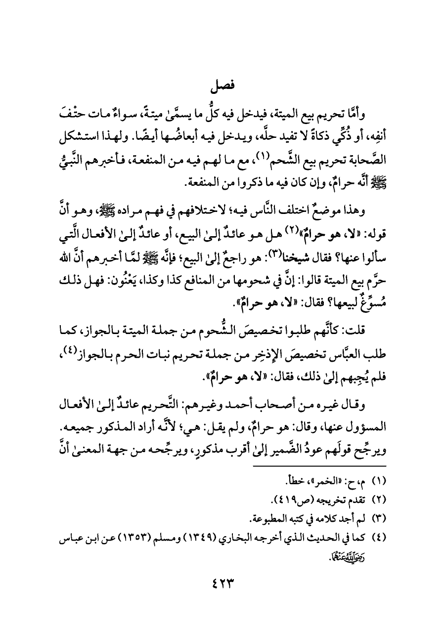 وهذا موضعٌ اختلف النَّاس فيه؛ لاختلافهم في فهم مراده - صلى الله عليه وسلم -، وهو أنَّ قوله: «لا، هو حرامٌ» (¬٢) هل هو عائدٌ إلى البيع، أو عائدٌ إلى الأفعال الَّتي سألوا عنها؟ فقال شيخنا (¬٣): هو راجعٌ إلى البيع؛ فإنَّه - صلى الله عليه وسلم - لمَّا أخبرهم أنَّ الله حرَّم بيع الميتة قالوا: إنَّ في شحومها من المنافع كذا وكذا، يَعْنُون: فهل ذلك مُسوِّغٌ لبيعها؟ فقال: «لا، هو حرامٌ».