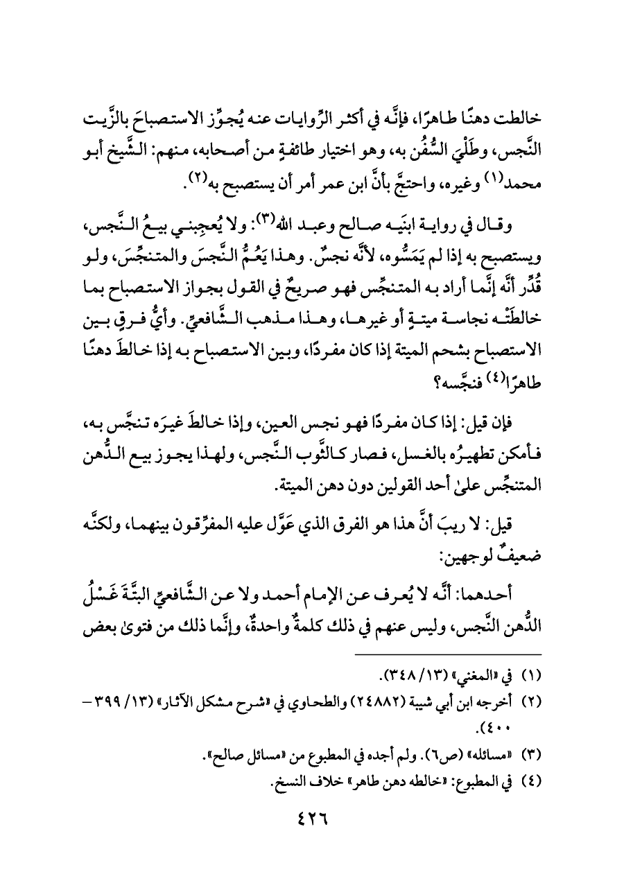 خالطت دهنًا طاهرًا، فإنَّه في أكثر الرِّوايات عنه يُجوِّز الاستصباحَ بالزَّيت النَّجس، وطَلْيَ السُّفُن به، وهو اختيار طائفةٍ من أصحابه، منهم: الشَّيخ أبو محمد (¬١) وغيره، واحتجَّ بأنَّ ابن عمر أمر أن يستصبح به (¬٢).