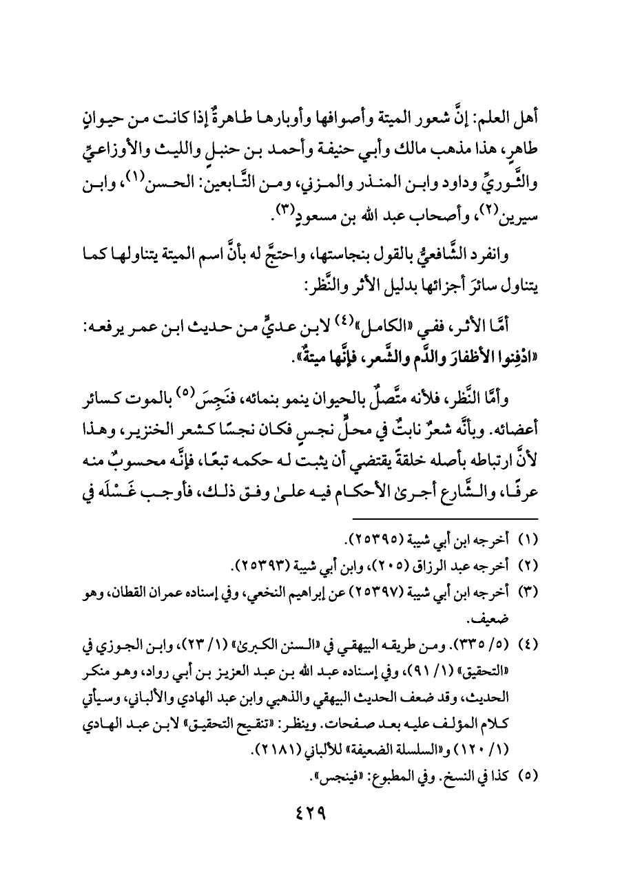 أمَّا الأثر، ففي «الكامل» (¬٤) لابن عديٍّ من حديث ابن عمر يرفعه: «ادْفِنوا الأظفارَ والدَّم والشَّعر، فإنَّها ميتةٌ».