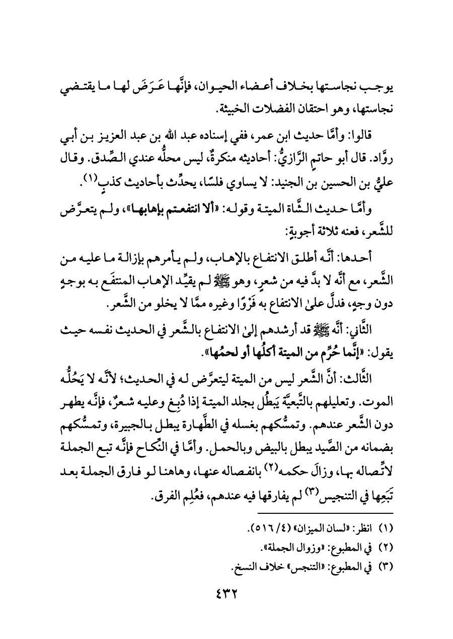 وأمَّا حديث الشَّاة الميتة وقوله: «ألا انتفعتم بإهابها»، ولم يتعرَّض للشَّعر، فعنه ثلاثة أجوبةٍ: