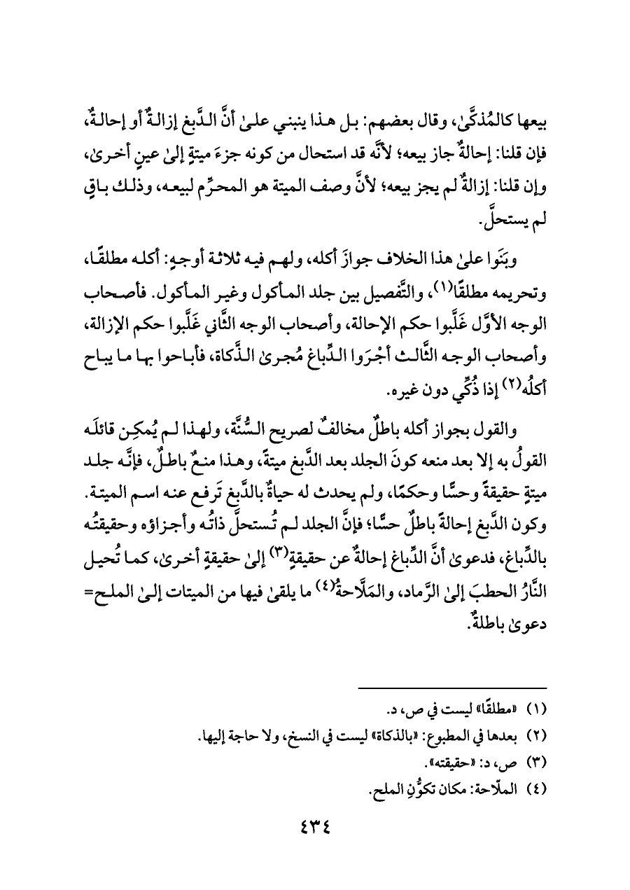 والقول بجواز أكله باطلٌ مخالفٌ لصريح السُّنَّة، ولهذا لم يُمكِن قائلَه القولُ به إلا بعد منعه كونَ الجلد بعد الدَّبغ ميتةً، وهذا منعٌ باطلٌ، فإنَّه جلد ميتةٍ حقيقةً وحسًّا وحكمًا، ولم يحدث له حياةٌ بالدَّبغ تَرفع عنه اسم الميتة. وكون الدَّبغ إحالةً باطلٌ حسًّا؛ فإنَّ الجلد لم تُستحلَّ ذاتُه وأجزاؤه وحقيقتُه بالدِّباغ، فدعوى أنَّ الدِّباغ إحالةٌ عن حقيقةٍ (¬٣) إلى حقيقةٍ أخرى، كما تُحيل النَّارُ الحطبَ إلى الرَّماد، والمَلَّاحةُ (¬٤) ما يلقى فيها من الميتات إلى الملح= دعوى باطلةٌ.