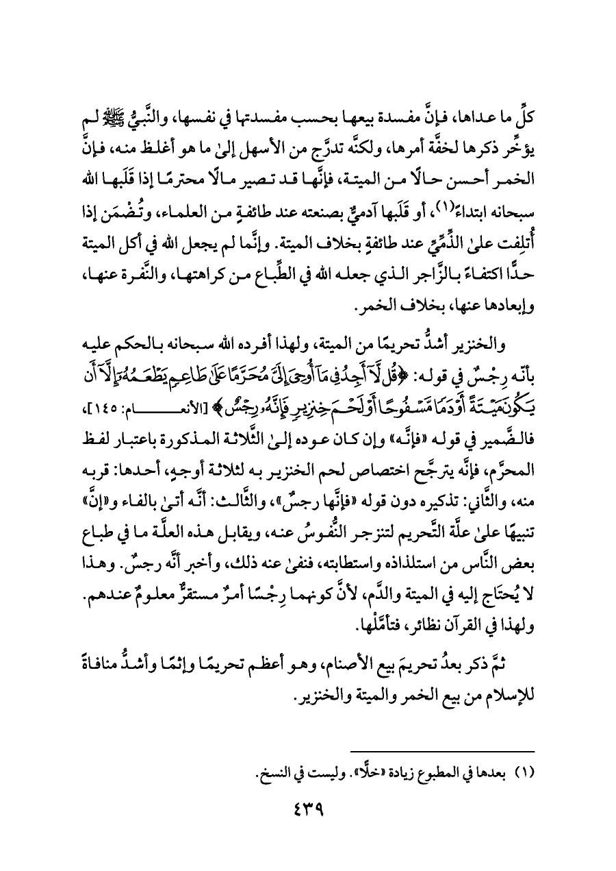 والخنزير أشدُّ تحريمًا من الميتة، ولهذا أفرده الله سبحانه بالحكم عليه بأنّه رِجْسٌ في قوله: {قُلْ لَا أَجِدُ فِي مَا أُوحِيَ إِلَيَّ مُحَرَّمًا عَلَى طَاعِمٍ يَطْعَمُهُ إِلَّا أَنْ يَكُونَ مَيْتَةً أَوْ دَمًا مَسْفُوحًا أَوْ لَحْمَ خِنْزِيرٍ فَإِنَّهُ رِجْسٌ} [الأنعام: ١٤٥]، فالضَّمير في قوله «فإنَّه» وإن كان عوده إلى الثَّلاثة المذكورة باعتبار لفظ المحرَّم، فإنَّه يترجَّح اختصاص لحم الخنزير به لثلاثة أوجهٍ، أحدها: قربه منه، والثَّاني: تذكيره دون قوله «فإنَّها رجسٌ»، والثَّالث: أنَّه أتى بالفاء و «إنَّ» تنبيهًا على علَّة التَّحريم لتنزجر النُّفوسُ عنه، ويقابل هذه العلَّة ما في طباع بعض النَّاس من استلذاذه واستطابته، فنفى عنه ذلك، وأخبر أنَّه رجسٌ. وهذا لا يُحتَاج إليه في الميتة والدَّم، لأنَّ كونهما رِجْسًا أمرٌ مستقرٌّ معلومٌ عندهم. ولهذا في القرآن نظائر، فتأمَّلْها.