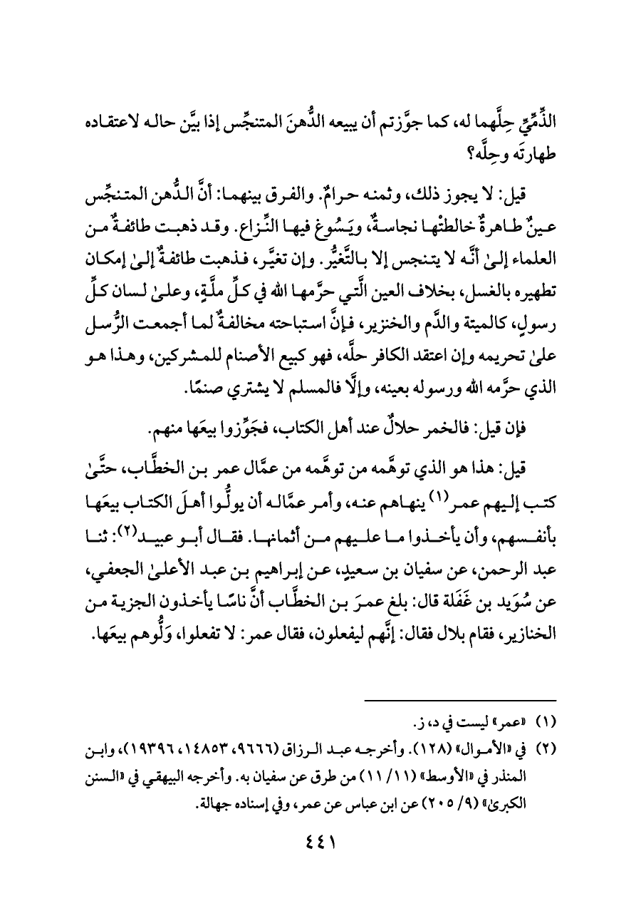 قيل: هذا هو الذي توهَّمه من توهَّمه من عمَّال عمر بن الخطَّاب، حتَّى كتب إليهم عمر (¬١) ينهاهم عنه، وأمر عمَّاله أن يولُّوا أهلَ الكتاب بيعَها بأنفسهم، وأن يأخذوا ما عليهم من أثمانها. فقال أبو عبيد (¬٢): ثنا عبد الرحمن، عن سفيان بن سعيدٍ، عن إبراهيم بن عبد الأعلى الجعفي، عن سُوَيد بن غَفَلة قال: بلغ عمرَ بن الخطَّاب أنَّ ناسًا يأخذون الجزية من الخنازير، فقام بلال فقال: إنَّهم ليفعلون، فقال عمر: لا تفعلوا، وَلُّوهم بيعَها.
