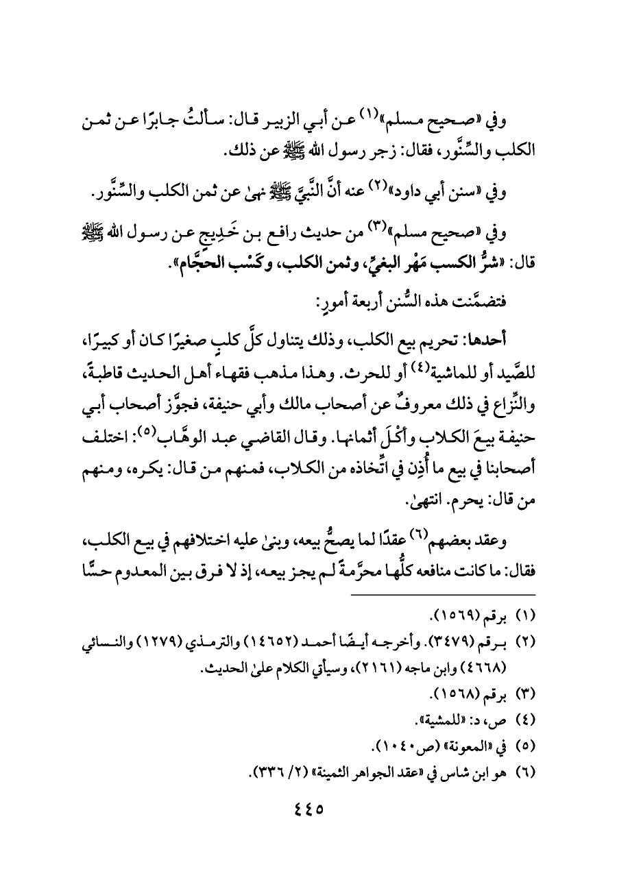 أحدها: تحريم بيع الكلب، وذلك يتناول كلَّ كلبٍ صغيرًا كان أو كبيرًا، للصَّيد أو للماشية (¬٤) أو للحرث. وهذا مذهب فقهاء أهل الحديث قاطبةً، والنِّزاع في ذلك معروفٌ عن أصحاب مالك وأبي حنيفة، فجوَّز أصحاب أبي حنيفة بيعَ الكلاب وأكْلَ أثمانها. وقال القاضي عبد الوهَّاب (¬٥): اختلف أصحابنا في بيع ما أُذِن في اتِّخاذه من الكلاب، فمنهم من قال: يكره، ومنهم من قال: يحرم. انتهى.
