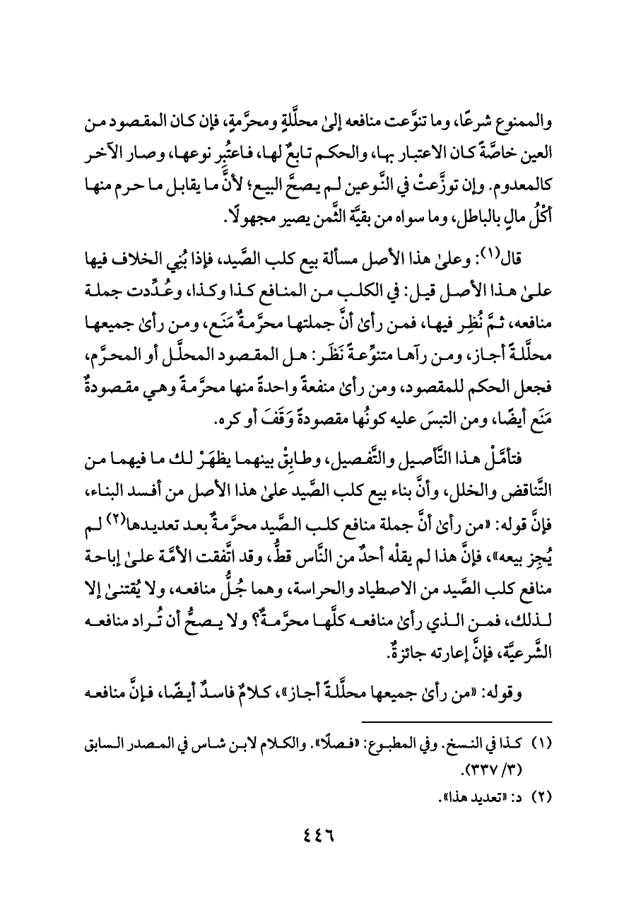 فتأمَّلْ هذا التَّأصيل والتَّفصيل، وطابِقْ بينهما يظهَرْ لك ما فيهما من التَّناقض والخلل، وأنَّ بناء بيع كلب الصَّيد على هذا الأصل من أفسد البناء، فإنَّ قوله: «من رأى أنَّ جملة منافع كلب الصَّيد محرَّمةٌ بعد تعديدها (¬٢) لم يُجِز بيعه»، فإنَّ هذا لم يقلْه أحدٌ من النَّاس قطُّ، وقد اتَّفقت الأمَّة على إباحة منافع كلب الصَّيد من الاصطياد والحراسة، وهما جُلُّ منافعه، ولا يُقتنى إلا لذلك، فمن الذي رأى منافعه كلَّها محرَّمةٌ؟ ولا يصحُّ أن تُراد منافعه الشَّرعيَّة، فإنَّ إعارته جائزةٌ.