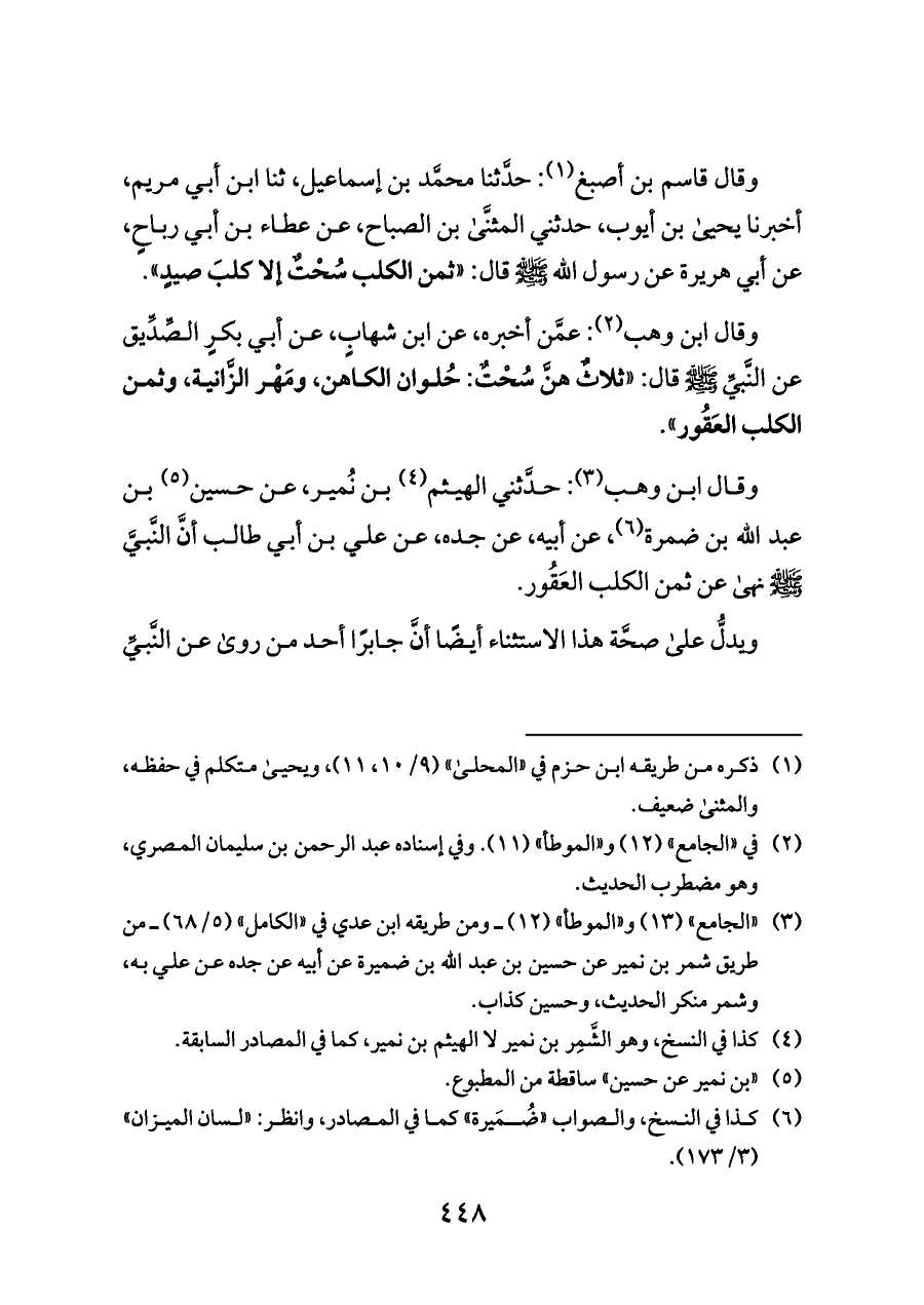 وقال قاسم بن أصبغ (¬٢): حدَّثنا محمَّد بن إسماعيل، ثنا ابن أبي مريم، أخبرنا يحيى بن أيوب، حدثني المثنَّى بن الصباح، عن عطاء بن أبي رباحٍ، عن أبي هريرة عن رسول الله - صلى الله عليه وسلم - قال: «ثمن الكلب سُحْتٌ إلا كلبَ صيدٍ».