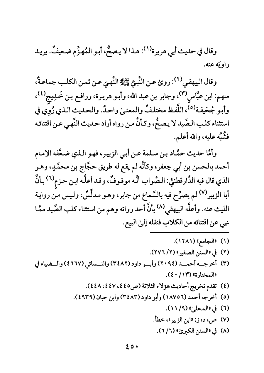 وأمَّا حديث حمَّاد بن سلمة عن أبي الزبير، فهو الذي ضعَّفه الإمام أحمد بالحسن بن أبي جعفر، وكأنَّه لم يقع له طريق حجَّاج بن محمَّدٍ، وهو الذي قال فيه الدَّارقطنيُّ: الصَّواب أنَّه موقوفٌ، وقد أعلَّه ابن حزمٍ (¬٦) بأنَّ أبا الزبير (¬٧) لم يصرِّح فيه بالسَّماع من جابر، وهو مدلِّسٌ، وليس من رواية الليث عنه. وأعلَّه البيهقي (¬٨) بأنَّ أحد رواته وهم من استثناء كلب الصَّيد ممَّا نهي عن اقتنائه من الكلاب فنقله إلى البيع.