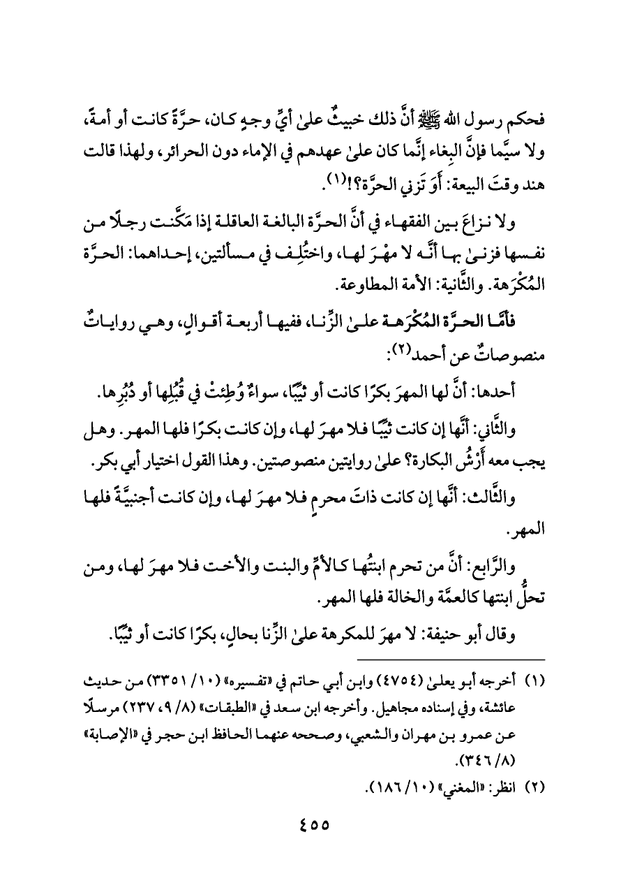 ولا نزاعَ بين الفقهاء في أنَّ الحرَّة البالغة العاقلة إذا مَكَّنت رجلًا من نفسها فزنى بها أنَّه لا مهْرَ لها، واختُلِف في مسألتين، إحداهما: الحرَّة المُكْرَهة. والثَّانية: الأمة المطاوعة.