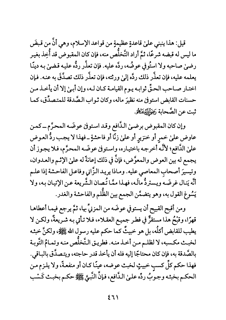 وإن كان المقبوض برضى الدَّافع وقد استوفى عوضَه المحرَّم ــ كمن عاوض على خمرٍ أو خنزيرٍ أو على زنًا أو فاحشةٍ ــ فهذا لا يجب ردُّ العوض على الدَّافع؛ لأنَّه أخرجه باختياره، واستوفى عوضَه المحرَّم، فلا يجوز أن يجمع له بين العوض والمعوَّض، فإنَّ في ذلك إعانةً له على الإثم والعدوان، وتيسيرَ أصحابِ المعاصي عليه. وماذا يريد الزَّاني وفاعل الفاحشة إذا علم أنَّه يَنال غرضَه ويستردُّ مالَه، فهذا ممَّا تُصان الشَّريعة عن الإتيان به، ولا يَسُوغ القول به، وهو يتضمَّن الجمع بين الظُّلم والفاحشة والغدر.