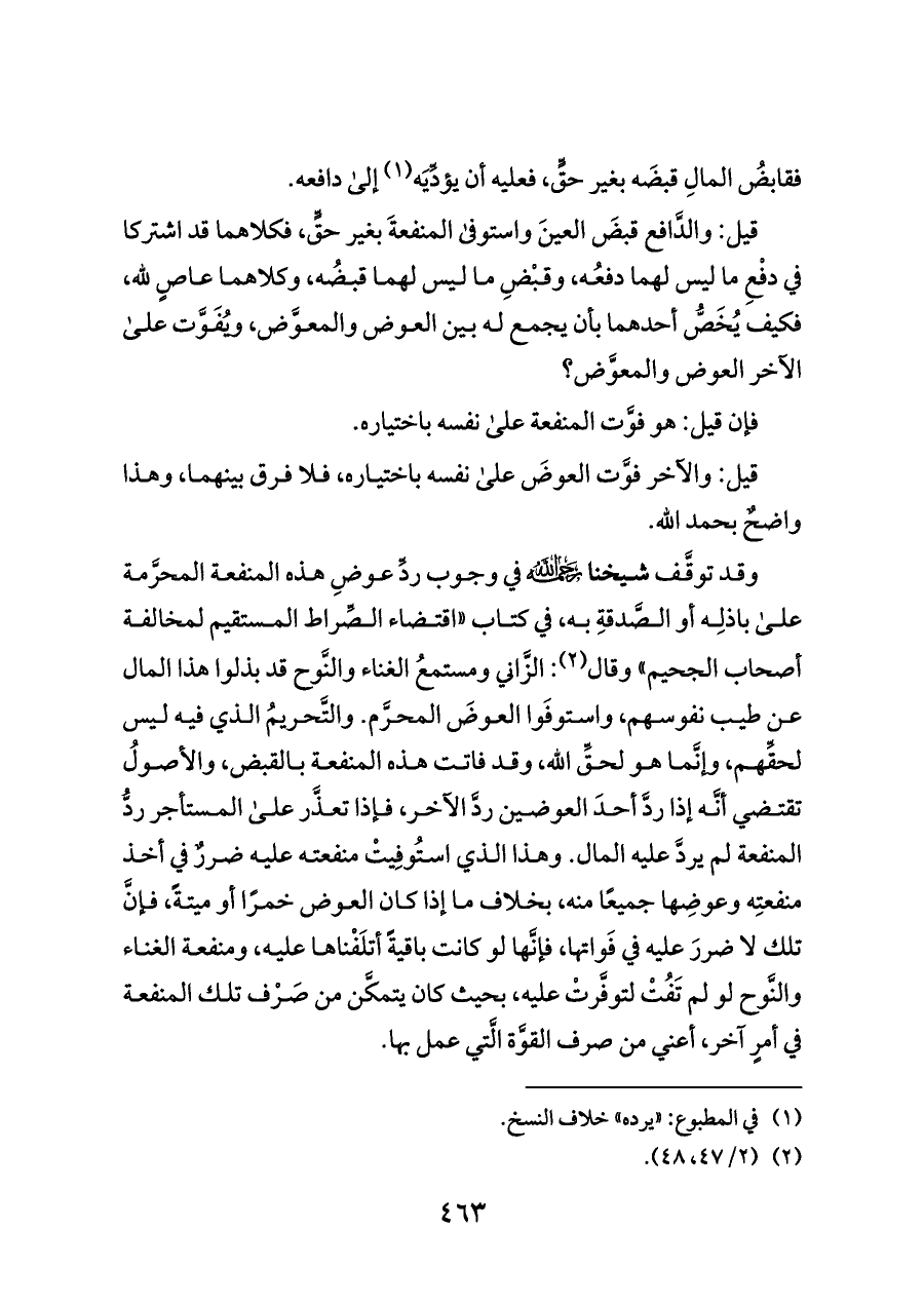 وقد توقَّف شيخنا - رحمه الله - في وجوب ردِّ عوضِ هذه المنفعة المحرَّمة على باذلِه أو الصَّدقةِ به، في كتاب «اقتضاء الصِّراط المستقيم لمخالفة أصحاب الجحيم» وقال (¬٢): الزَّاني ومستمعُ الغناء والنَّوح قد بذلوا هذا المال عن طيب نفوسهم، واستوفَوا العوضَ المحرَّم. والتَّحريمُ الذي فيه ليس لحقِّهم، وإنَّما هو لحقِّ الله، وقد فاتت هذه المنفعة بالقبض، والأصولُ تقتضي أنَّه إذا ردَّ أحدَ العوضين ردَّ الآخر، فإذا تعذَّر على المستأجر ردُّ المنفعة لم يردَّ عليه المال. وهذا الذي استُوفِيتْ منفعته عليه ضررٌ في أخذ منفعتِه وعوضِها جميعًا منه، بخلاف ما إذا كان العوض خمرًا أو ميتةً، فإنَّ تلك لا ضررَ عليه في فَواتها، فإنَّها لو كانت باقيةً أتلَفْناها عليه، ومنفعة الغناء والنَّوح لو لم تَفُتْ لتوفَّرتْ عليه، بحيث كان يتمكَّن من صَرْف تلك المنفعة في أمرٍ آخر، أعني من صرف القوَّة الَّتي عمل بها.