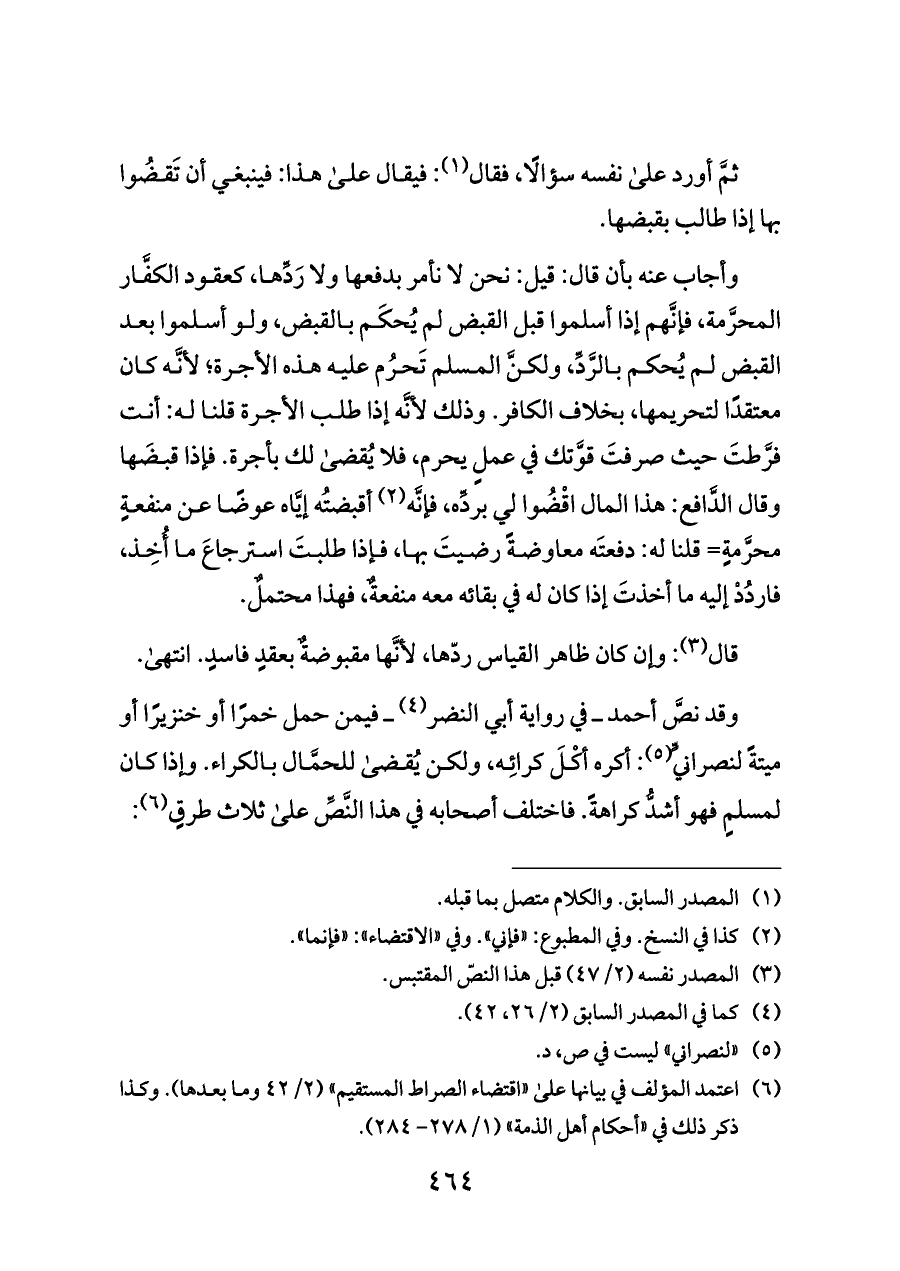 وقد نصَّ أحمد ــ في رواية أبي النضر (¬٤) ــ فيمن حمل خمرًا أو خنزيرًا أو ميتةً لنصرانيٍّ (¬٥): أكره أكْلَ كرائِه، ولكن يُقضى للحمَّال بالكراء. وإذا كان لمسلمٍ فهو أشدُّ كراهةً. فاختلف أصحابه في هذا النَّصِّ على ثلاث طرقٍ (¬٦):