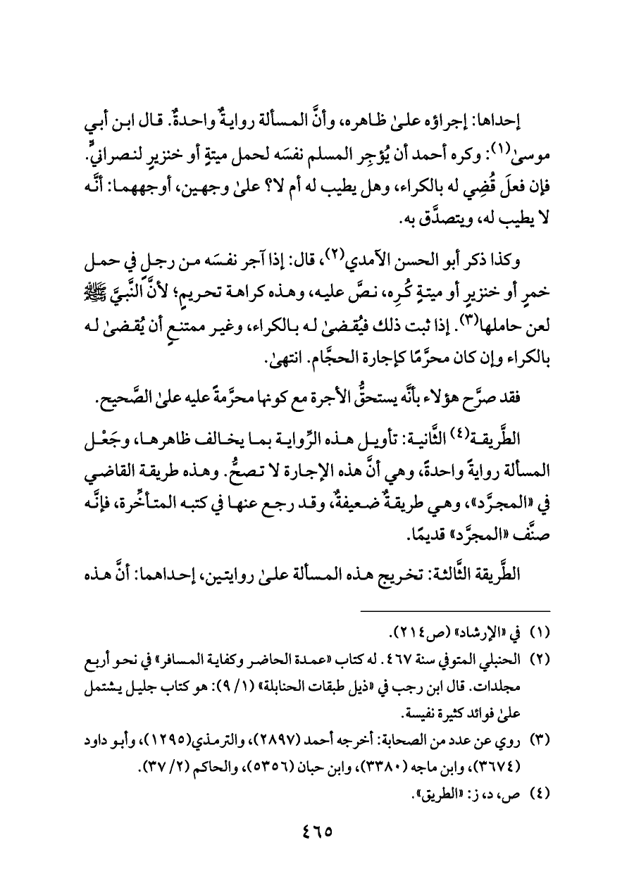 إحداها: إجراؤه على ظاهره، وأنَّ المسألة روايةٌ واحدةٌ. قال ابن أبي موسى (¬١): وكره أحمد أن يُؤجِر المسلم نفسَه لحمل ميتةٍ أو خنزيرٍ لنصرانيٍّ. فإن فعلَ قُضِي له بالكراء، وهل يطيب له أم لا؟ على وجهين، أوجههما: أنَّه لا يطيب له، ويتصدَّق به.