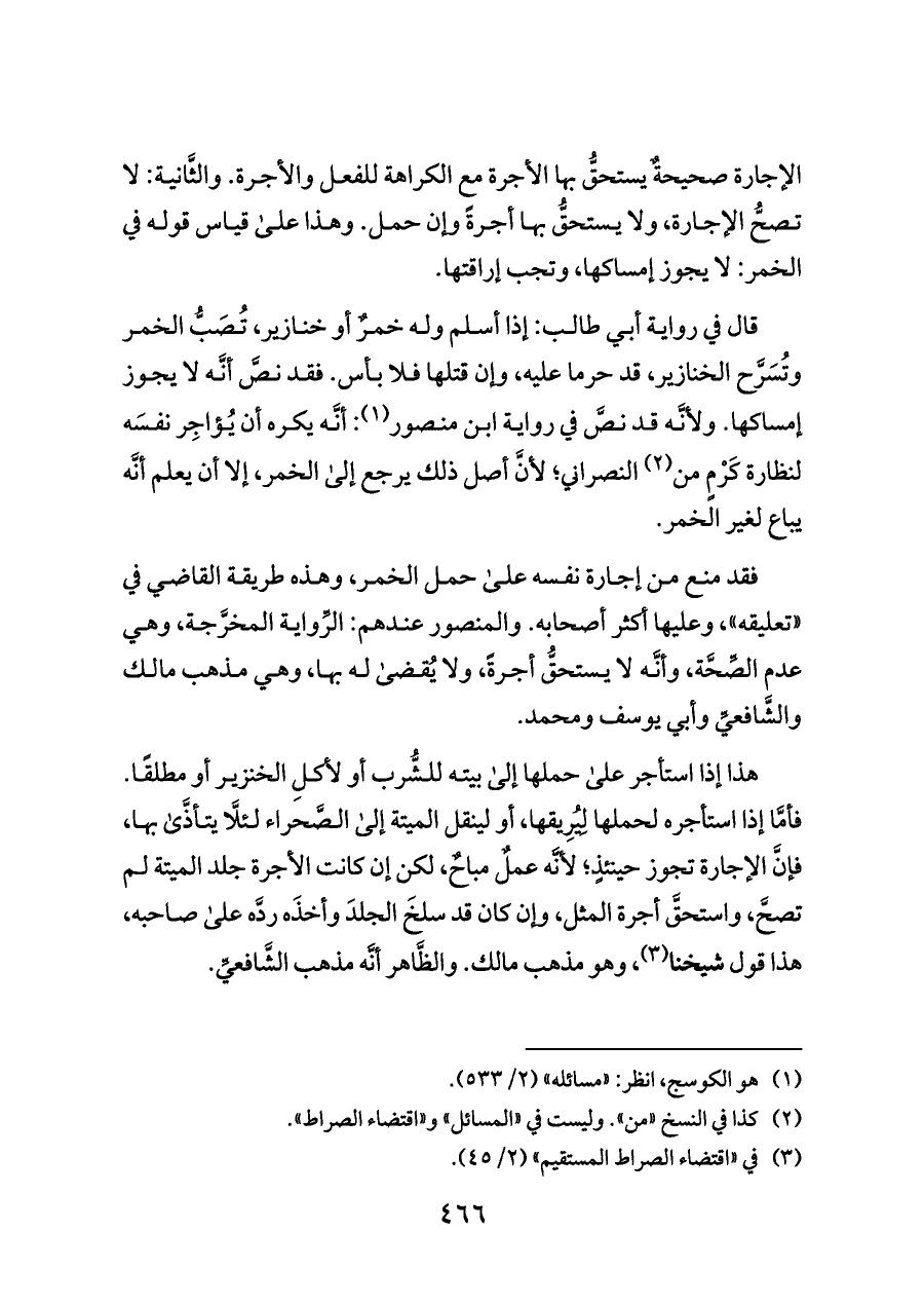 فقد منع من إجارة نفسه على حمل الخمر، وهذه طريقة القاضي في «تعليقه»، وعليها أكثر أصحابه. والمنصور عندهم: الرِّواية المخرَّجة، وهي عدم الصِّحَّة، وأنَّه لا يستحقُّ أجرةً، ولا يُقضى له بها، وهي مذهب مالك والشَّافعيِّ وأبي يوسف ومحمد.