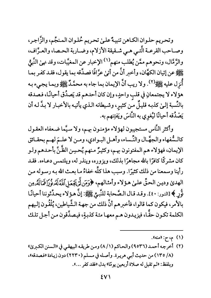 وتحريم حلوان الكاهن تنبيهٌ على تحريم حُلوان المنجِّم، والزَّاجر، وصاحب القرعة الَّتي هي شقيقة الأزلام، وضاربة الحصا، والعرَّاف، والرَّمَّال، ونحوهم ممَّن يُطلب منهم (¬١) الإخبار عن المغيَّبات، وقد نهى النَّبيُّ - صلى الله عليه وسلم - عن إتيان الكهَّان، وأخبر أنَّ من أتى عرَّافًا فصدَّقه بما يقول، فقد كفر بما أُنزِل عليه - صلى الله عليه وسلم - (¬٢). ولا ريب أنَّ الإيمان بما جاء به محمَّدٌ - صلى الله عليه وسلم - وبما يجيء به هؤلاء لا يجتمعانِ في قلبٍ واحدٍ، وإن كان أحدهم قد يَصدُق أحيانًا، فصدقه بالنِّسبة إلى كذبه قليلٌ من كثيرٍ، وشيطانه الذي يأتيه بالأخبار لا بدَّ له أن يَصْدُقه أحيانًا ليُغوِي به النَّاسَ ويَفتِنهم به.