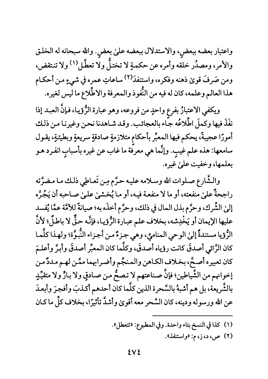 ويكفي الاعتبارُ بفرعٍ واحدٍ من فروعه، وهو عبارة الرُّؤيا، فإنَّ العبد إذا نفَذَ فيها وكملَ اطِّلاعُه جاء بالعجائب. وقد شاهدنا نحن وغيرنا من ذلك أمورًا عجيبةً، يحكم فيها المعبِّر بأحكامٍ متلازمةٍ صادقةٍ سريعةٍ وبطيئةٍ، يقول سامعها: هذه علم غيبٍ. وإنَّما هي معرفة ما غاب عن غيره بأسبابٍ انفرد هو بعلمها، وخفيت على غيره.