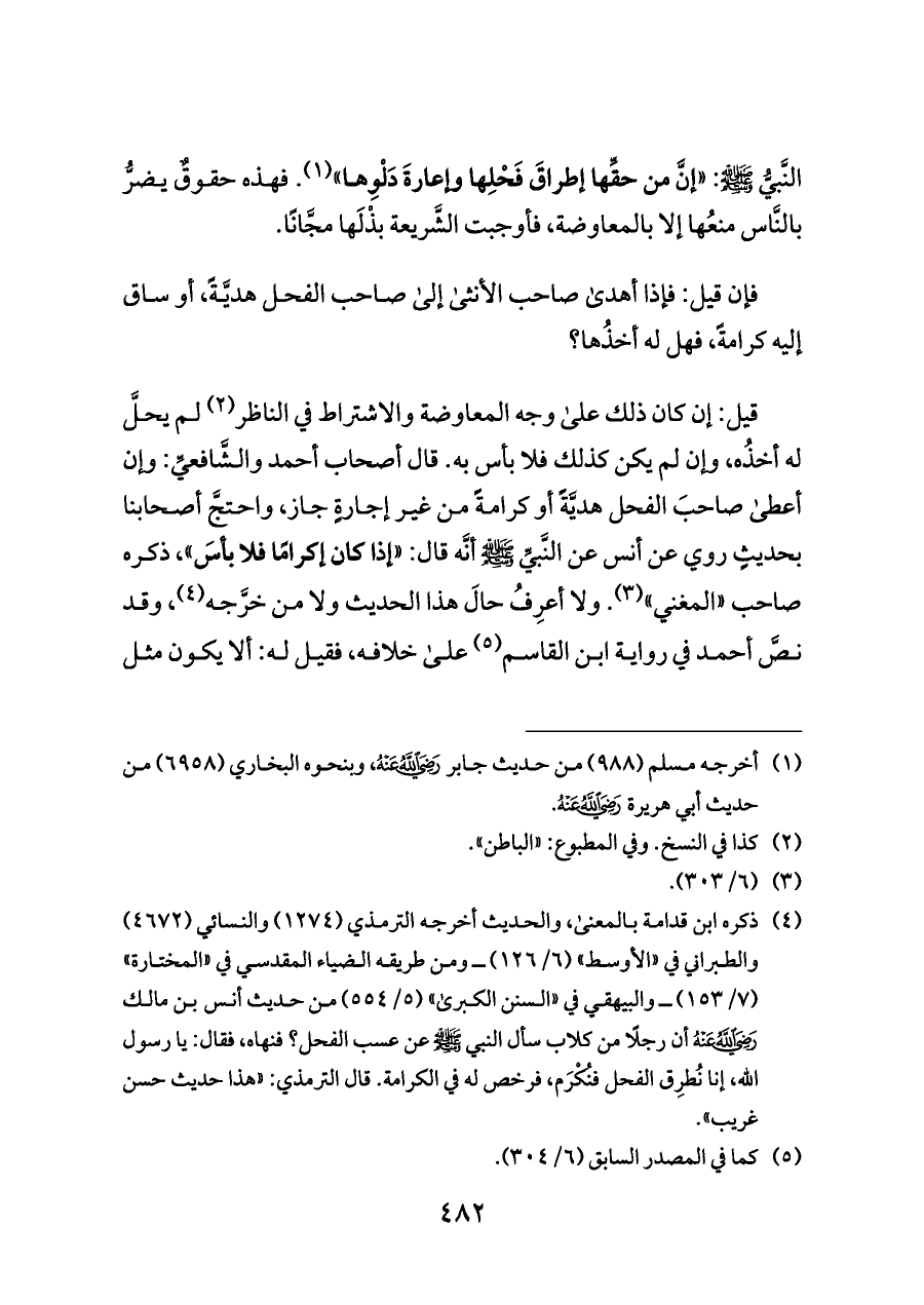 قيل: إن كان ذلك على وجه المعاوضة والاشتراط في الناظر (¬٢) لم يحلَّ له أخذُه، وإن لم يكن كذلك فلا بأس به. قال أصحاب أحمد والشَّافعيِّ: وإن أعطى صاحبَ الفحل هديَّةً أو كرامةً من غير إجارةٍ جاز، واحتجَّ أصحابنا بحديثٍ روي عن أنس عن النَّبيِّ - صلى الله عليه وسلم - أنَّه قال: «إذا كان إكرامًا فلا بأسَ»، ذكره صاحب «المغني» (¬٣). ولا أعرِفُ حالَ هذا الحديث ولا من خرَّجه (¬٤)، وقد نصَّ أحمد في رواية ابن القاسم (¬٥) على خلافه، فقيل له: ألا يكون مثل