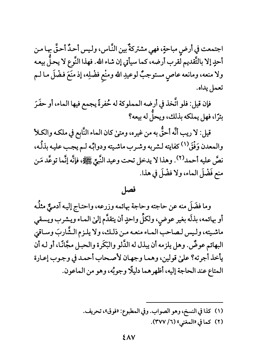 قيل: لا ريب أنَّه أحقُّ به من غيره، ومتى كان الماء النَّابع في ملكه والكلأ والمعدن وَفْقَ (¬١) كفايته لشربه وشرب ماشيته ودوابِّه لم يجب عليه بذلُه، نصَّ عليه أحمد (¬٢). وهذا لا يدخل تحت وعيد النَّبيِّ - صلى الله عليه وسلم -، فإنَّه إنَّما توعَّد مَن منع فَضْلَ الماء، ولا فضْلَ في هذا.