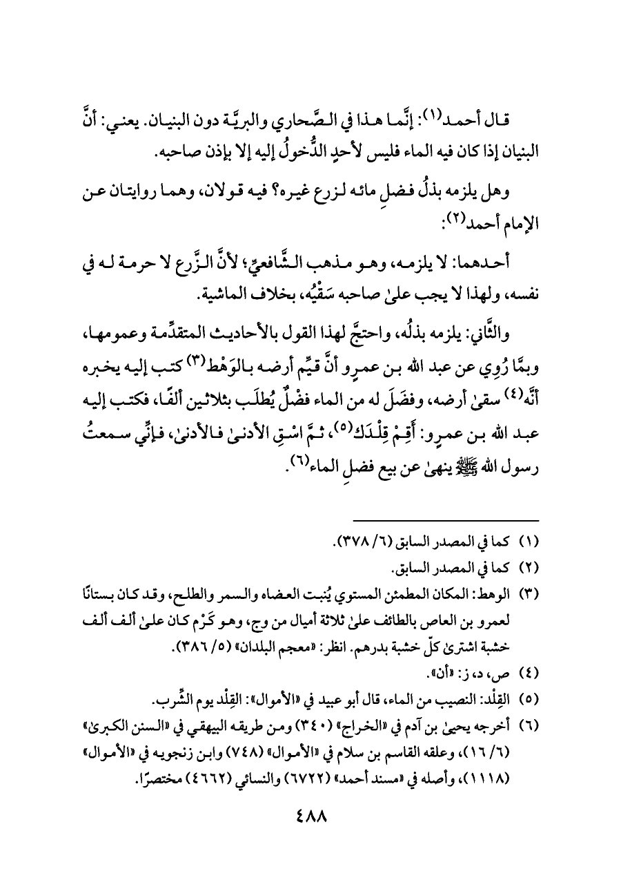 والثَّاني: يلزمه بذلُه، واحتجَّ لهذا القول بالأحاديث المتقدِّمة وعمومها، وبمَّا رُوِي عن عبد الله بن عمرٍو أنَّ قيِّم أرضه بالوَهْط (¬٣) كتب إليه يخبره أنَّه (¬٤) سقى أرضه، وفضَلَ له من الماء فضْلٌ يُطلَب بثلاثين ألفًا، فكتب إليه عبد الله بن عمرٍو: أَقِمْ قِلْدَك (¬٥)، ثمَّ اسْقِ الأدنى فالأدنى، فإنِّي سمعتُ رسول الله - صلى الله عليه وسلم - ينهى عن بيع فضلِ الماء (¬٦).