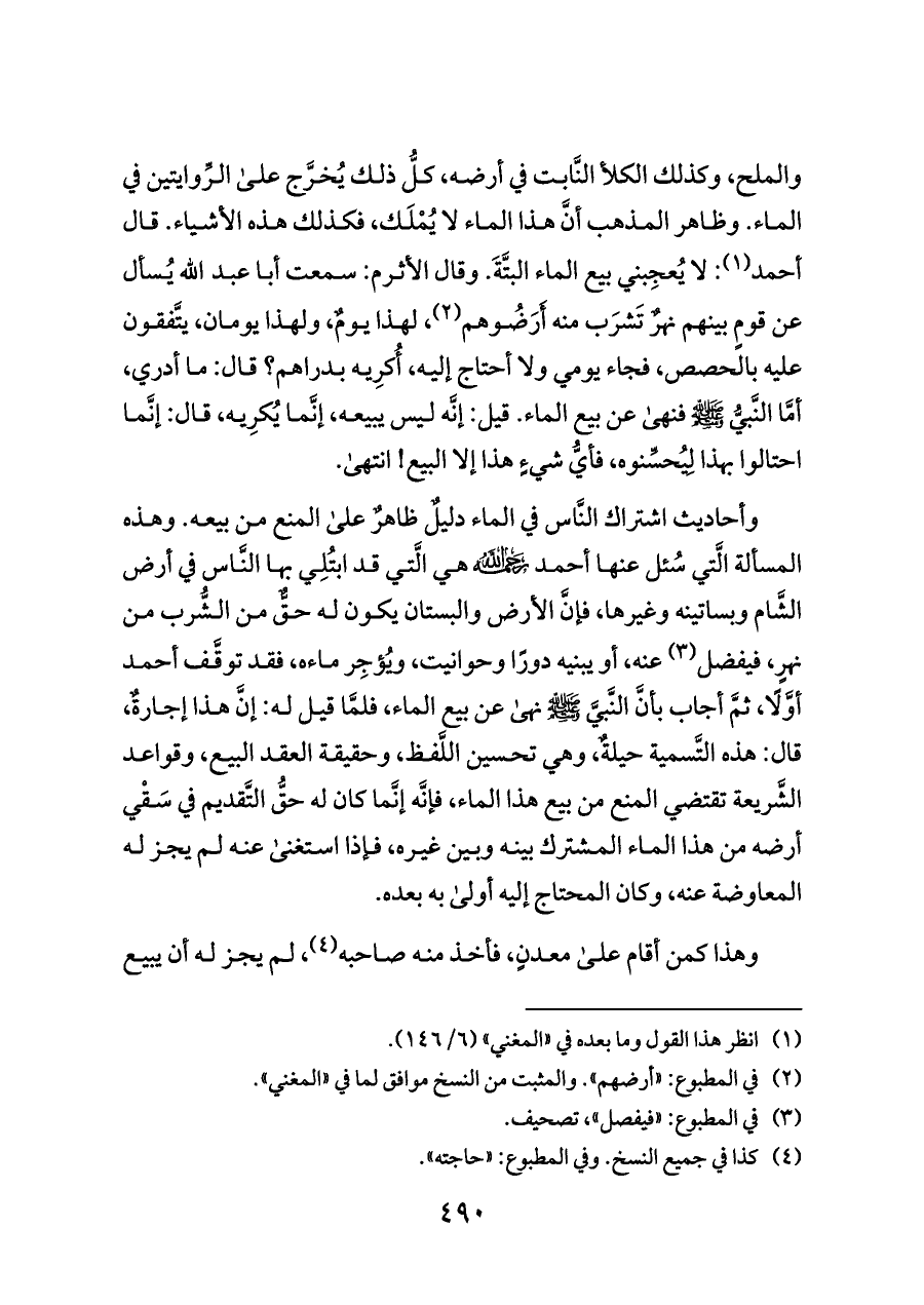 والملح، وكذلك الكلأ النَّابت في أرضه، كلُّ ذلك يُخرَّج على الرِّوايتين في الماء. وظاهر المذهب أنَّ هذا الماء لا يُمْلَك، فكذلك هذه الأشياء. قال أحمد (¬١): لا يُعجِبني بيع الماء البتَّةَ. وقال الأثرم: سمعت أبا عبد الله يُسأل عن قومٍ بينهم نهرٌ تَشرَب منه أَرَضُوهم (¬٢)، لهذا يومٌ، ولهذا يومان، يتَّفقون عليه بالحصص، فجاء يومي ولا أحتاج إليه، أُكرِيه بدراهم؟ قال: ما أدري، أمَّا النَّبيُّ - صلى الله عليه وسلم - فنهى عن بيع الماء. قيل: إنَّه ليس يبيعه، إنَّما يُكرِيه، قال: إنَّما احتالوا بهذا لِيُحسِّنوه، فأيُّ شيءٍ هذا إلا البيع! انتهى.