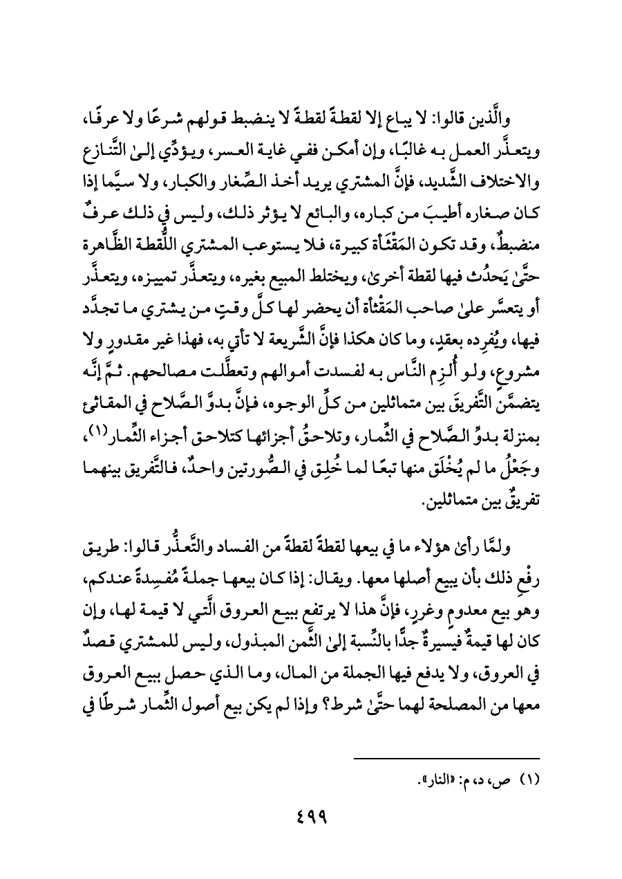 والَّذين قالوا: لا يباع إلا لقطةً لقطةً لا ينضبط قولهم شرعًا ولا عرفًا، ويتعذَّر العمل به غالبًا، وإن أمكن ففي غاية العسر، ويؤدِّي إلى التَّنازع والاختلاف الشَّديد، فإنَّ المشتري يريد أخذ الصِّغار والكبار، ولا سيَّما إذا كان صغاره أطيبَ من كباره، والبائع لا يؤثر ذلك، وليس في ذلك عرفٌ منضبطٌ، وقد تكون المَقْثَأة كبيرة، فلا يستوعب المشتري اللُّقطة الظَّاهرة حتَّى يَحدُث فيها لقطة أخرى، ويختلط المبيع بغيره، ويتعذَّر تمييزه، ويتعذَّر أو يتعسَّر على صاحب المَقْثأة أن يحضر لها كلَّ وقتٍ من يشتري ما تجدَّد فيها، ويُفرِده بعقدٍ، وما كان هكذا فإنَّ الشَّريعة لا تأتي به، فهذا غير مقدورٍ ولا مشروعٍ، ولو أُلزِم النَّاس به لفسدت أموالهم وتعطَّلت مصالحهم. ثمَّ إنَّه يتضمَّن التَّفريقَ بين متماثلين من كلِّ الوجوه، فإنَّ بدوَّ الصَّلاح في المقاثئ بمنزلة بدوِّ الصَّلاح في الثِّمار، وتلاحقُ أجزائها كتلاحق أجزاء الثِّمار (¬١)، وجَعْلُ ما لم يُخْلَق منها تبعًا لما خُلِق في الصُّورتين واحدٌ، فالتَّفريق بينهما تفريقٌ بين متماثلين.