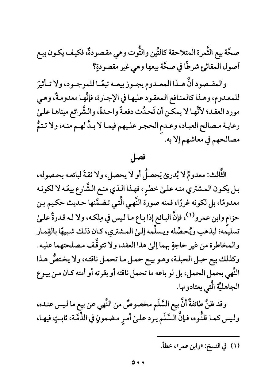 الثَّالث: معدومٌ لا يُدرى يَحصلُ أو لا يحصل، ولا ثقةَ لبائعه بحصوله، بل يكون المشتري منه على خطرٍ، فهذا الذي منع الشَّارع بيعَه لا لكونه معدومًا، بل لكونه غررًا، فمنه صورة النَّهي الَّتي تضمَّنها حديث حكيم بن حزامٍ وابن عمرو (¬١)، فإنَّ البائع إذا باع ما ليس في مِلكه، ولا له قدرةٌ على تسليمه؛ ليذهب ويُحصِّله ويسلِّمه إلى المشتري، كان ذلك شبيهًا بالقِمار والمخاطرة من غير حاجةٍ بهما إلى هذا العقد، ولا تتوقَّف مصلحتهما عليه. وكذلك بيع حبل الحبلة، وهو بيع حمل ما تحمل ناقته، ولا يختصُّ هذا النَّهي بحمل الحمل، بل لو باعه ما تحمل ناقته أو بقرته أو أمته كان من بيوع الجاهليَّة الَّتي يعتادونها.