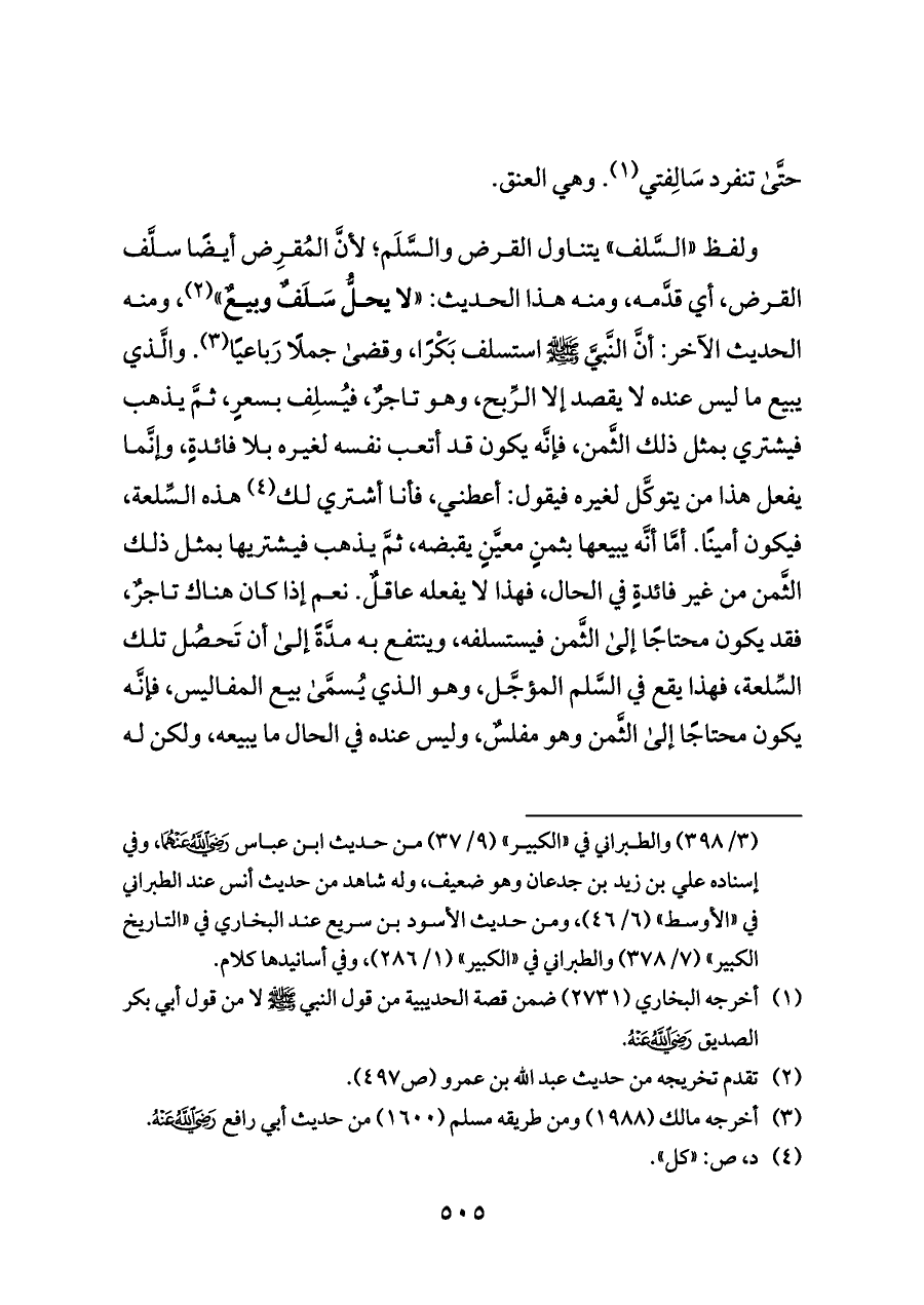 ولفظ «السَّلف» يتناول القرض والسَّلَم؛ لأنَّ المُقرِض أيضًا سلَّف القرض، أي قدَّمه، ومنه هذا الحديث: «لا يحلُّ سَلَفٌ وبيعٌ» (¬٢)، ومنه الحديث الآخر: أنَّ النَّبيَّ - صلى الله عليه وسلم - استسلف بَكْرًا، وقضى جملًا رَباعيًا (¬٣). والَّذي يبيع ما ليس عنده لا يقصد إلا الرِّبح، وهو تاجرٌ، فيُسلِف بسعرٍ، ثمَّ يذهب فيشتري بمثل ذلك الثَّمن، فإنَّه يكون قد أتعب نفسه لغيره بلا فائدةٍ، وإنَّما يفعل هذا من يتوكَّل لغيره فيقول: أعطني، فأنا أشتري لك (¬٤) هذه السِّلعة، فيكون أمينًا. أمَّا أنَّه يبيعها بثمنٍ معيَّنٍ يقبضه، ثمَّ يذهب فيشتريها بمثل ذلك الثَّمن من غير فائدةٍ في الحال، فهذا لا يفعله عاقلٌ. نعم إذا كان هناك تاجرٌ، فقد يكون محتاجًا إلى الثَّمن فيستسلفه، وينتفع به مدَّةً إلى أن تَحصُل تلك السِّلعة، فهذا يقع في السَّلم المؤجَّل، وهو الذي يُسمَّى بيع المفاليس، فإنَّه يكون محتاجًا إلى الثَّمن وهو مفلسٌ، وليس عنده في الحال ما يبيعه، ولكن له