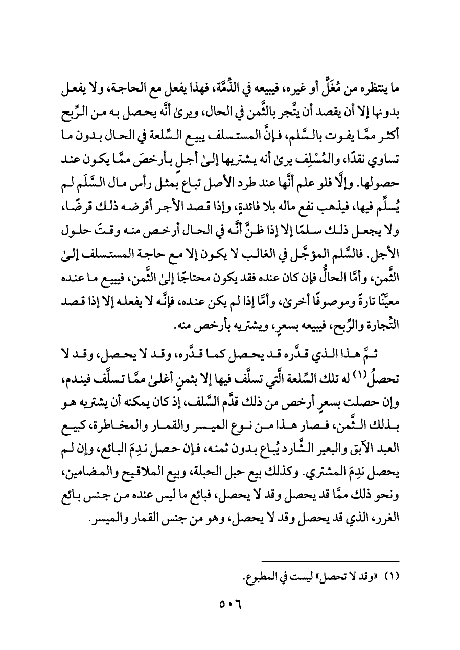 وإلَّا فلو علم أنَّها عند طرد الأصل تباع بمثل رأس مال السَّلَم لم يُسلِّم فيها، فيذهب نفع ماله بلا فائدةٍ، وإذا قصد الأجر أقرضه ذلك قرضًا، ولا يجعل ذلك سلمًا إلا إذا ظنَّ أنَّه في الحال أرخص منه وقتَ حلول الأجل. فالسَّلم المؤجَّل في الغالب لا يكون إلا مع حاجة المستسلف إلى الثَّمن، وأمَّا الحالُّ فإن كان عنده فقد يكون محتاجًا إلى الثَّمن، فيبيع ما عنده معيَّنًا تارةً وموصوفًا أخرى، وأمَّا إذا لم يكن عنده، فإنَّه لا يفعله إلا إذا قصد التِّجارة والرِّبح، فيبيعه بسعرٍ، ويشتريه بأرخص منه.