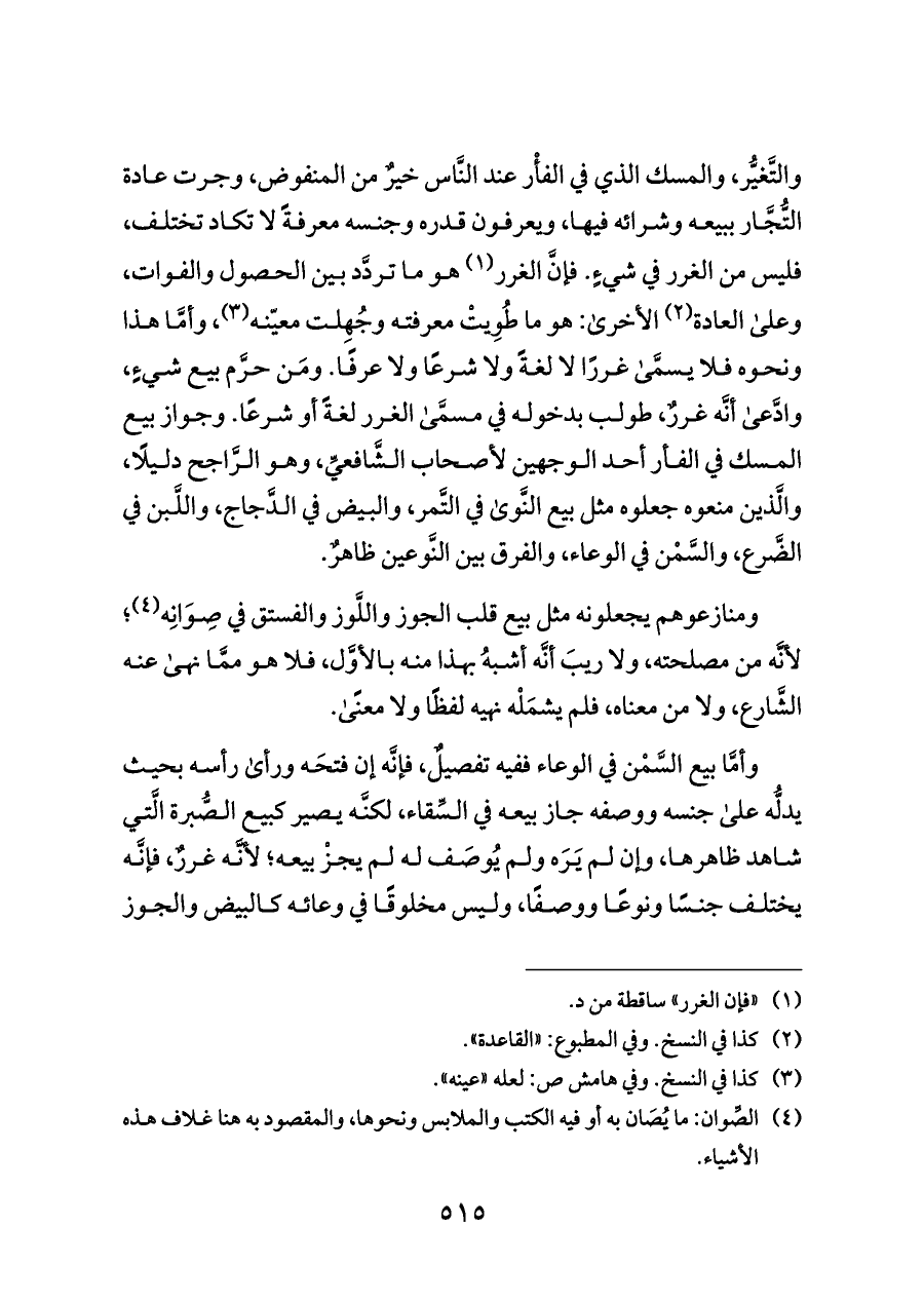 والتَّغيُّر، والمسك الذي في الفأْر عند النَّاس خيرٌ من المنفوض، وجرت عادة التُّجَّار ببيعه وشرائه فيها، ويعرفون قدره وجنسه معرفةً لا تكاد تختلف، فليس من الغرر في شيءٍ. فإنَّ الغرر (¬١) هو ما تردَّد بين الحصول والفوات، وعلى العادة (¬٢) الأخرى: هو ما طُوِيتْ معرفته وجُهِلت معيّنه (¬٣)، وأمَّا هذا ونحوه فلا يسمَّى غررًا لا لغةً ولا شرعًا ولا عرفًا. ومَن حرَّم بيع شيءٍ، وادَّعى أنَّه غررٌ، طولب بدخوله في مسمَّى الغرر لغةً أو شرعًا. وجواز بيع المسك في الفأر أحد الوجهين لأصحاب الشَّافعيِّ، وهو الرَّاجح دليلًا، والَّذين منعوه جعلوه مثل بيع النَّوى في التَّمر، والبيض في الدَّجاج، واللَّبن في الضَّرع، والسَّمْن في الوعاء، والفرق بين النَّوعين ظاهرٌ.