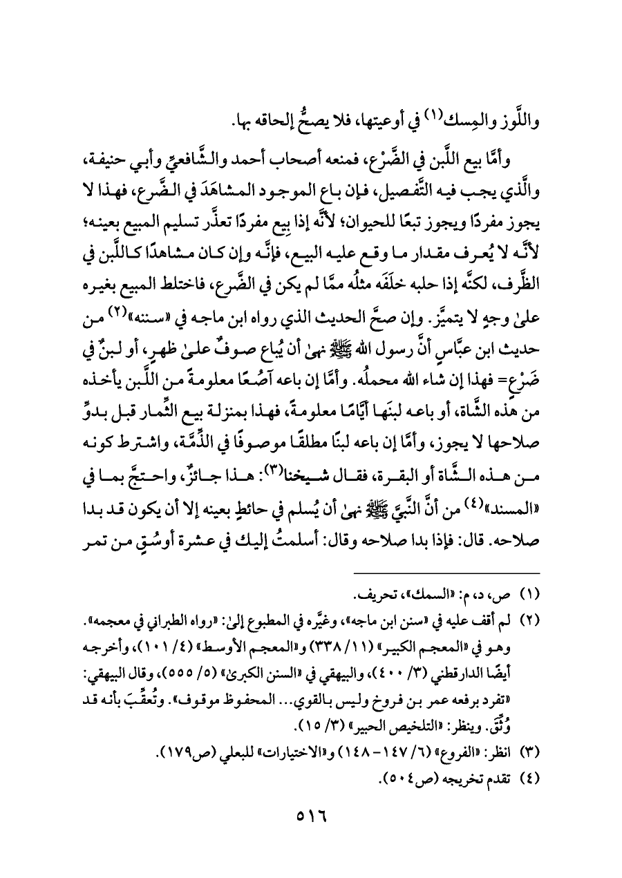 وأمَّا بيع اللَّبن في الضَّرْع، فمنعه أصحاب أحمد والشَّافعيِّ وأبي حنيفة، والَّذي يجب فيه التَّفصيل، فإن باع الموجود المشاهَدَ في الضَّرع، فهذا لا يجوز مفردًا ويجوز تبعًا للحيوان؛ لأنَّه إذا بِيع مفردًا تعذَّر تسليم المبيع بعينه؛ لأنَّه لا يُعرف مقدار ما وقع عليه البيع، فإنَّه وإن كان مشاهدًا كاللَّبن في الظَّرف، لكنَّه إذا حلبه خلَفَه مثلُه ممَّا لم يكن في الضَّرع، فاختلط المبيع بغيره على وجهٍ لا يتميَّز. وإن صحَّ الحديث الذي رواه ابن ماجه في «سننه» (¬٢) من حديث ابن عبَّاسٍ أنَّ رسول الله - صلى الله عليه وسلم - نهى أن يُباع صوفٌ على ظهرٍ، أو لبنٌ في ضَرْعٍ= فهذا إن شاء الله محملُه. وأمَّا إن باعه آصُعًا معلومةً من اللَّبن يأخذه من هذه الشَّاة، أو باعه لبنَها أيَّامًا معلومةً، فهذا بمنزلة بيع الثِّمار قبل بدوِّ صلاحها لا يجوز، وأمَّا إن باعه لبنًا مطلقًا موصوفًا في الذِّمَّة، واشترط كونه من هذه الشَّاة أو البقرة، فقال شيخنا (¬٣): هذا جائزٌ، واحتجَّ بما في «المسند» (¬٤) من أنَّ النَّبيَّ - صلى الله عليه وسلم - نهى أن يُسلم في حائطٍ بعينه إلا أن يكون قد بدا صلاحه. قال: فإذا بدا صلاحه وقال: أسلمتُ إليك في عشرة أوسُقٍ من تمر