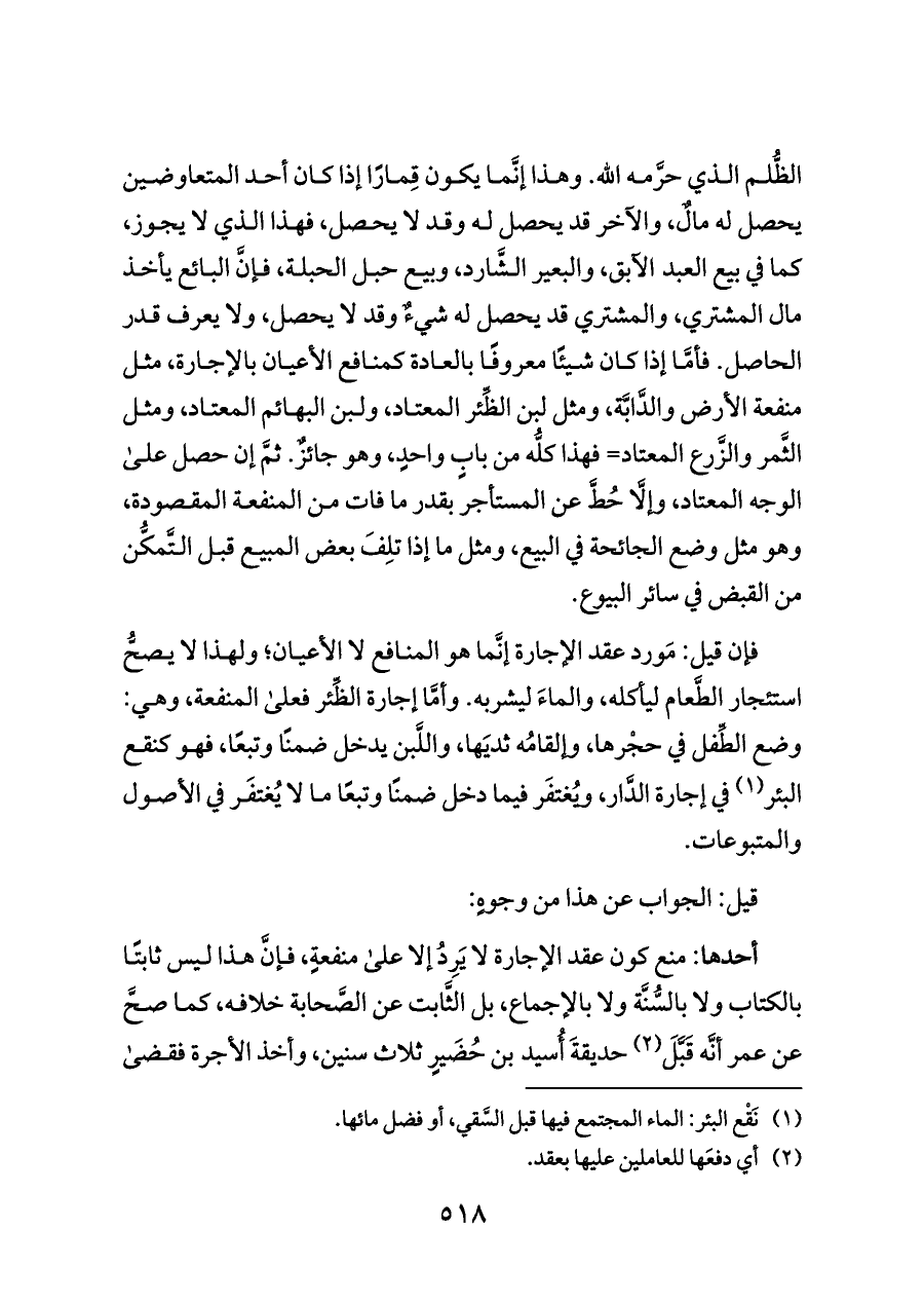الظُّلم الذي حرَّمه الله. وهذا إنَّما يكون قِمارًا إذا كان أحد المتعاوضين يحصل له مالٌ، والآخر قد يحصل له وقد لا يحصل، فهذا الذي لا يجوز, كما في بيع العبد الآبق، والبعير الشَّارد، وبيع حبل الحبلة، فإنَّ البائع يأخذ مال المشتري، والمشتري قد يحصل له شيءٌ وقد لا يحصل، ولا يعرف قدر الحاصل. فأمَّا إذا كان شيئًا معروفًا بالعادة كمنافع الأعيان بالإجارة, مثل منفعة الأرض والدَّابَّة، ومثل لبن الظِّئر المعتاد، ولبن البهائم المعتاد، ومثل الثَّمر والزَّرع المعتاد= فهذا كلُّه من بابٍ واحدٍ, وهو جائزٌ. ثمَّ إن حصل على الوجه المعتاد، وإلَّا حُطَّ عن المستأجر بقدر ما فات من المنفعة المقصودة، وهو مثل وضع الجائحة في البيع، ومثل ما إذا تلِفَ بعض المبيع قبل التَّمكُّن من القبض في سائر البيوع.