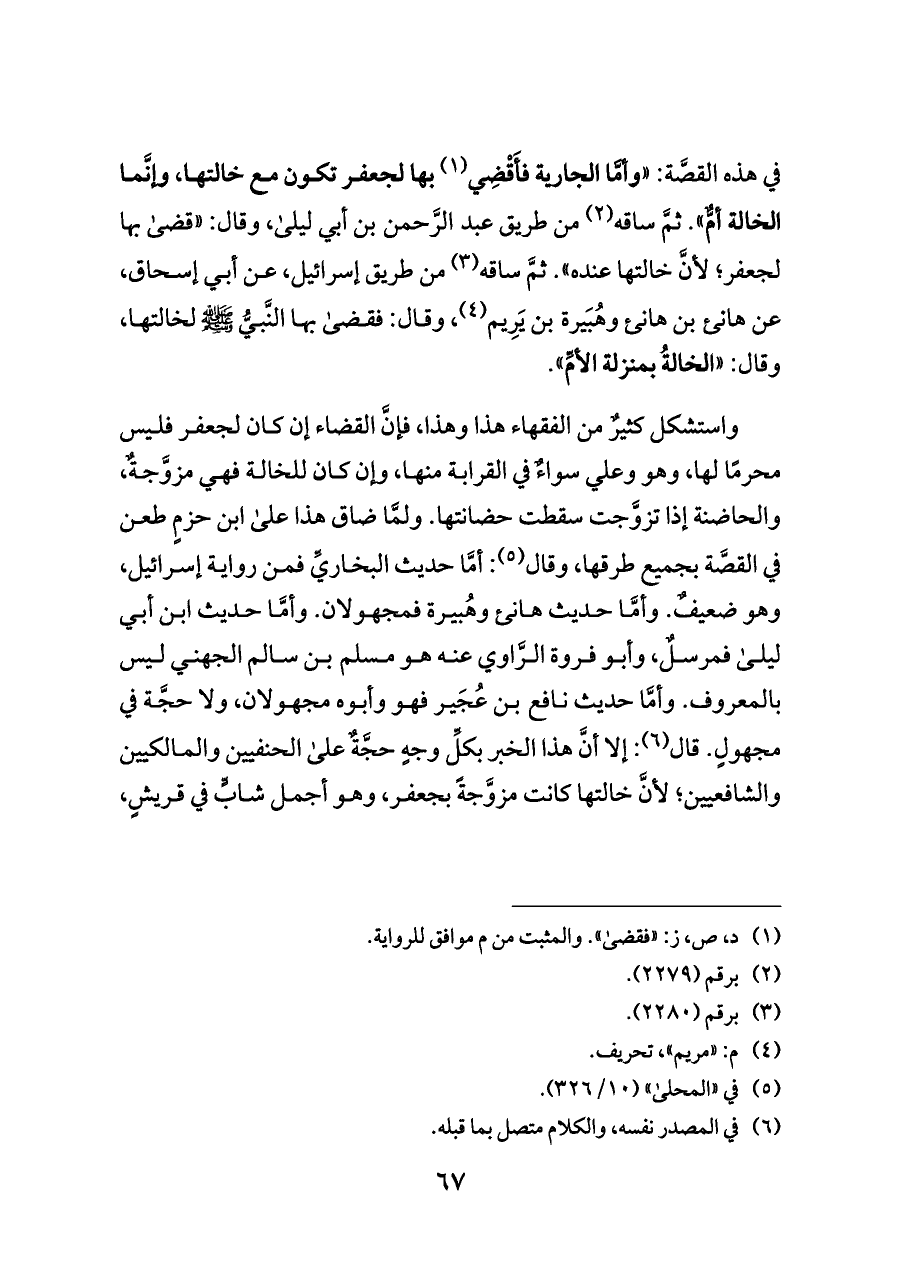 واستشكل كثيرٌ من الفقهاء هذا وهذا، فإنَّ القضاء إن كان لجعفر فليس محرمًا لها، وهو وعلي سواءٌ في القرابة منها، وإن كان للخالة فهي مزوَّجةٌ، والحاضنة إذا تزوَّجت سقطت حضانتها. ولمَّا ضاق هذا على ابن حزمٍ طعن في القصَّة بجميع طرقها، وقال (¬٥): أمَّا حديث البخاريِّ فمن رواية إسرائيل، وهو ضعيفٌ. وأمَّا حديث هانئ وهُبيرة فمجهولان. وأمَّا حديث ابن أبي ليلى فمرسلٌ، وأبو فروة الرَّاوي عنه هو مسلم بن سالم الجهني ليس بالمعروف. وأمَّا حديث نافع بن عُجَير فهو وأبوه مجهولان، ولا حجَّة في مجهولٍ. قال (¬٦): إلا أنَّ هذا الخبر بكلِّ وجهٍ حجَّةٌ على الحنفيين والمالكيين والشافعيين؛ لأنَّ خالتها كانت مزوَّجةً بجعفر، وهو أجمل شابٍّ في قريشٍ،