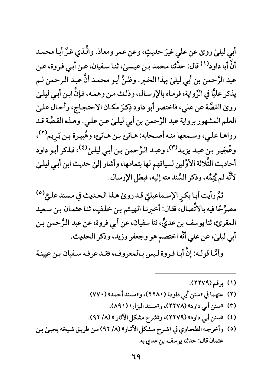 أبي ليلى روى عن علي غيرَ حديثٍ، وعن عمر ومعاذ. والَّذي غرَّ أبا محمد أنَّ أبا داود (¬١) قال: حدَّثنا محمد بن عيسى، ثنا سفيان، عن أبي فروة، عن عبد الرَّحمن بن أبي ليلى بهذا الخبر. وظنَّ أبو محمد أنَّ عبد الرحمن لم يذكر عليًّا في الرِّواية، فرماه بالإرسال، وذلك من وهمه، فإنَّ ابن أبي ليلى روى القصَّة عن علي، فاختصر أبو داود ذِكرَ مكان الاحتجاج، وأحال على العلم المشهور برواية عبد الرَّحمن بن أبي ليلى عن علي. وهذه القصَّة قد رواها علي، وسمعها منه أصحابه: هانئ بن هانئ، وهُبيرة بن يَرِيم (¬٢)، وعُجَير بن عبد يزيد (¬٣)، وعبد الرَّحمن بن أبي ليلى (¬٤)، فذكر أبو داود أحاديث الثَّلاثة الأوَّلين لسياقهم لها بتمامها، وأشار إلى حديث ابن أبي ليلى لأنَّه لم يُتِمَّه، وذكر السَّند منه إليه، فبطل الإرسال.