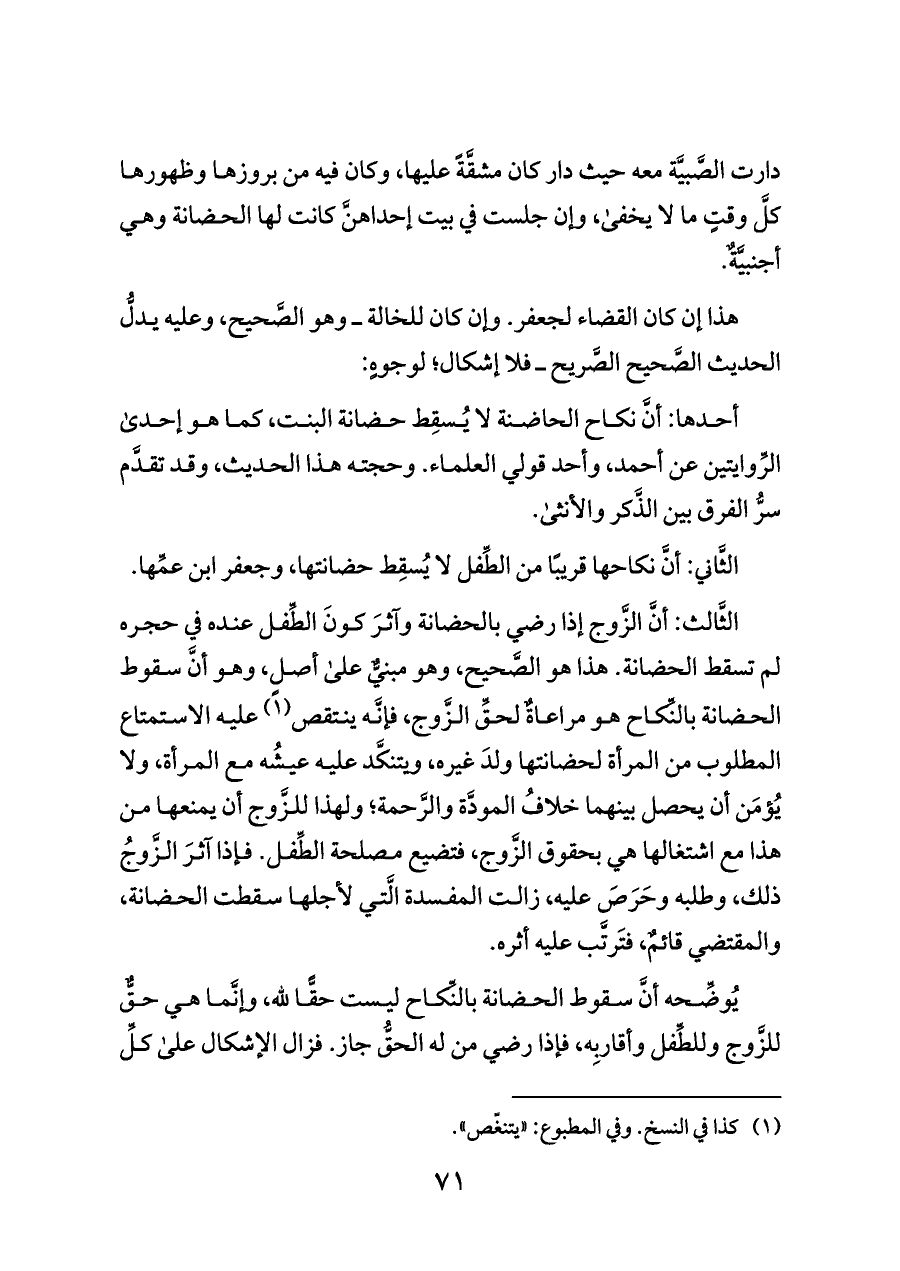 الثَّاني: أنَّ نكاحها قريبًا من الطِّفل لا يُسقِط حضانتها، وجعفر ابن عمِّها.