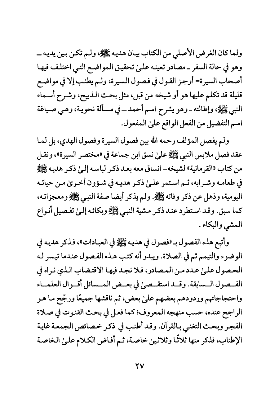 ولم يفصل المؤلف رحمه الله بين فصول السيرة وفصول الهدي، بل لما عقد فصل ملابس النبي - صلى الله عليه وسلم - على نسق ابن جماعة في «مختصر السيرة»، ونقل من كتاب «القرمانية» لشيخه= انساق معه بعد ذكر لباسه إلى ذكر هديه - صلى الله عليه وسلم - في طعامه وشرابه، ثم استمر على ذكر هديه في شؤون أخرى من حياته اليومية، وذهل عن ذكر وفاته - صلى الله عليه وسلم -. ولم يذكر أيضا صفة النبي - صلى الله عليه وسلم - ومعجزاته، كما سبق. وقد استطرد عند ذكر مشية النبي - صلى الله عليه وسلم - وبكائه إلى تفصيل أنواع المشي والبكاء.