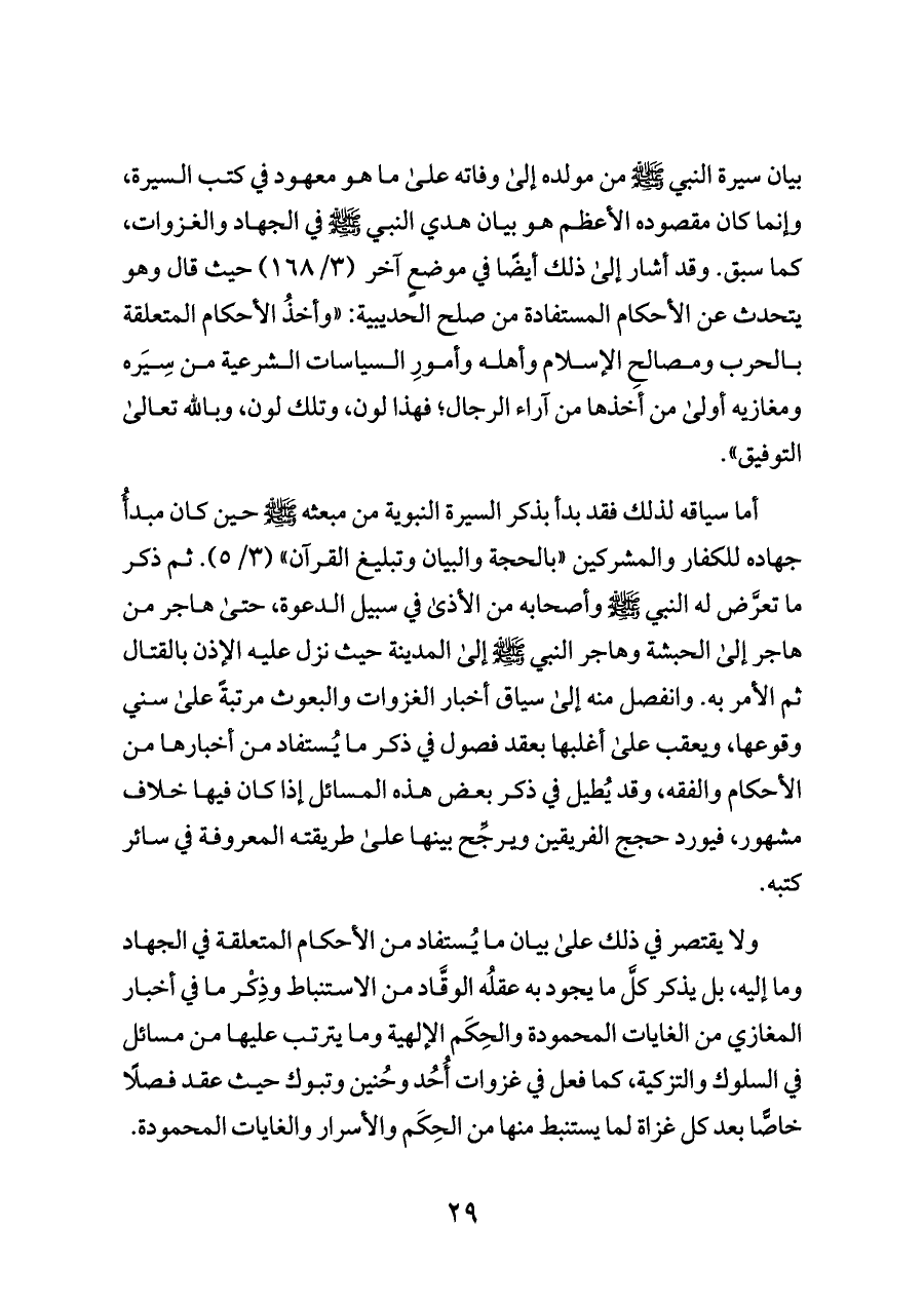 بيان سيرة النبي - صلى الله عليه وسلم - من مولده إلى وفاته على ما هو معهود في كتب السيرة، وإنما كان مقصوده الأعظم هو بيان هدي النبي - صلى الله عليه وسلم - في الجهاد والغزوات، كما سبق. وقد أشار إلى ذلك أيضًا في موضعٍ آخر (٣/ ١٦٨) حيث قال وهو يتحدث عن الأحكام المستفادة من صلح الحديبية: «وأخذُ الأحكام المتعلقة بالحرب ومصالحِ الإسلام وأهله وأمورِ السياسات الشرعية من سِيَره ومغازيه أولى من أخذها من آراء الرجال؛ فهذا لون، وتلك لون، وبالله تعالى التوفيق».