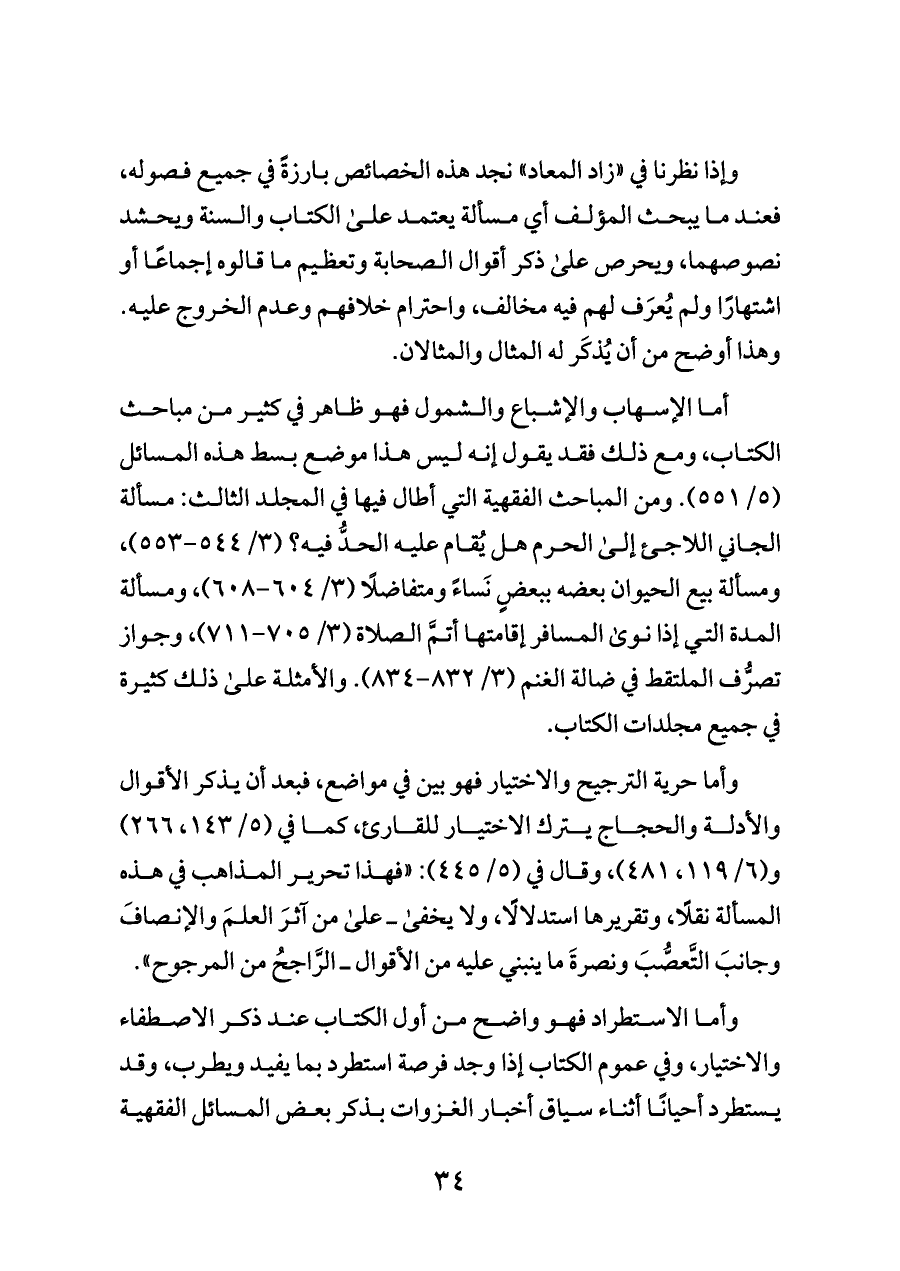 وإذا نظرنا في «زاد المعاد» نجد هذه الخصائص بارزةً في جميع فصوله، فعند ما يبحث المؤلف أي مسألة يعتمد على الكتاب والسنة ويحشد نصوصهما، ويحرص على ذكر أقوال الصحابة وتعظيم ما قالوه إجماعًا أو اشتهارًا ولم يُعرَف لهم فيه مخالف، واحترام خلافهم وعدم الخروج عليه. وهذا أوضح من أن يُذكَر له المثال والمثالان.