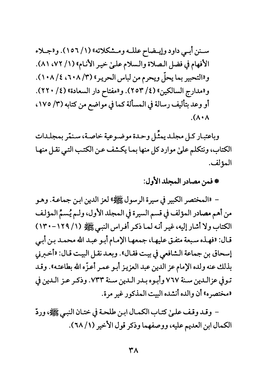 - «المختصر الكبير في سيرة الرسول - صلى الله عليه وسلم -» لعز الدين ابن جماعة. وهو من أهم مصادر المؤلف في قسم السيرة في المجلد الأول، ولم يُسمِّ المؤلف الكتاب ولا أشار إليه، غير أنه لما ذكر أفراس النبي - صلى الله عليه وسلم - (١/ ١٢٩ - ١٣٠) قال: «فهذه سبعة متفق عليها، جمعها الإمام أبو عبد الله محمد بن أبي إسحاق بن جماعة الشافعي في بيت فقال». وبعد نقل البيت قال: «أخبرني بذلك عنه ولده الإمام عز الدين عبد العزيز أبو عمر أعزّه الله بطاعته». وقد توفي عزالدين سنة ٧٦٧ وأبوه بدر الدين سنة ٧٣٣. وذكر عز الدين في «مختصره» أن والده أنشده البيت المذكور غير مرة.