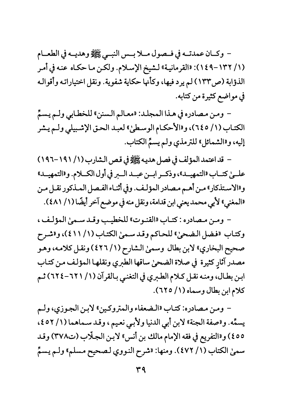 - ومن مصادره في هذا المجلد: «معالم السنن» للخطابي ولم يسمِّ الكتاب (١/ ٦٤٥)، و «الأحكام الوسطى» لعبد الحق الإشبيلي ولم يشر إليه، و «الشمائل» للترمذي ولم يسمِّ الكتاب.
