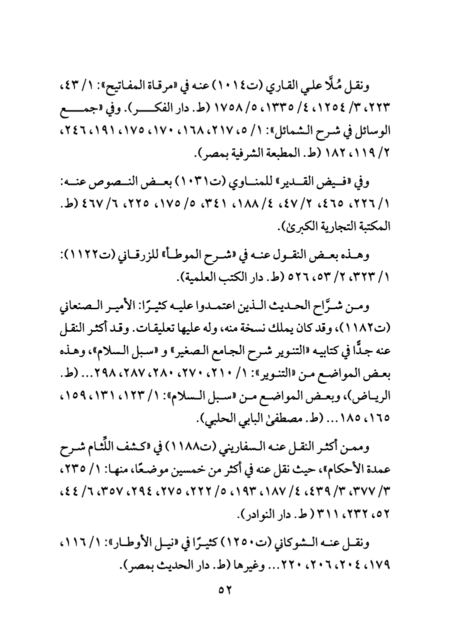 ونقل عنه الشوكاني (ت ١٢٥٠) كثيرًا في «نيل الأوطار»: ١/ ١١٦، ١٧٩، ٢٠٤، ٢٠٦، ٢٢٠ ... وغيرها (ط. دار الحديث بمصر).