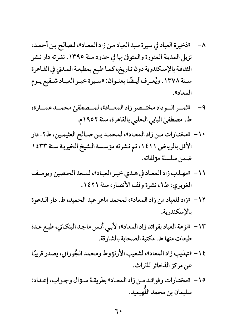 ١٠ - «مختارات من زاد المعاد»، لمحمد بن صالح العثيمين، ط ٢. دار الأفق بالرياض ١٤١١، ثم نشرته مؤسسة الشيخ الخيرية سنة ١٤٣٣ ضمن سلسلة مؤلفاته.