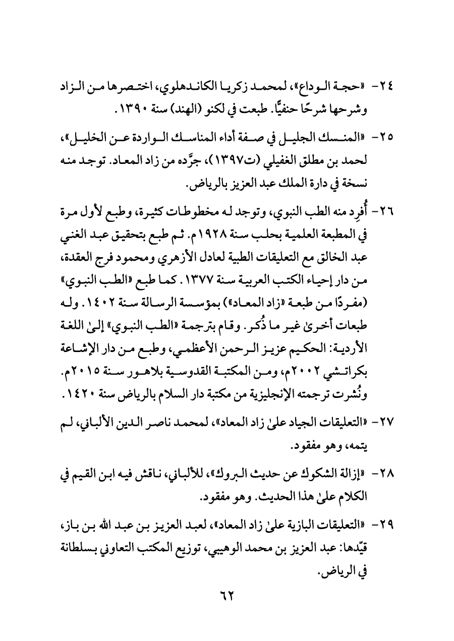 ٢٤ - «حجة الوداع»، لمحمد زكريا الكاندهلوي، اختصرها من الزاد وشرحها شرحًا حنفيًّا. طبعت في لكنو (الهند) سنة ١٣٩٠.