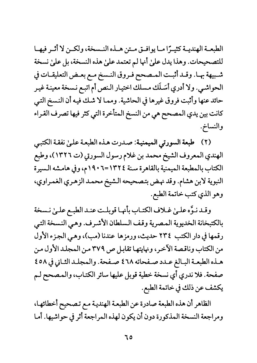 (٢) طبعة السورتي الميمنية: صدرت هذه الطبعة على نفقة الكتبي الهندي المعروف الشيخ محمد بن غلام رسول السورتي (ت ١٣٢٦)، وطبع الكتاب بالمطبعة الميمنية بالقاهرة سنة ١٣٢٤=١٩٠٦ م، وفي هامشه السيرة النبوية لابن هشام. وقد نهض بتصحيحه الشيخ محمد الزهري الغمراوي، وهو الذي كتب خاتمة الطبع.