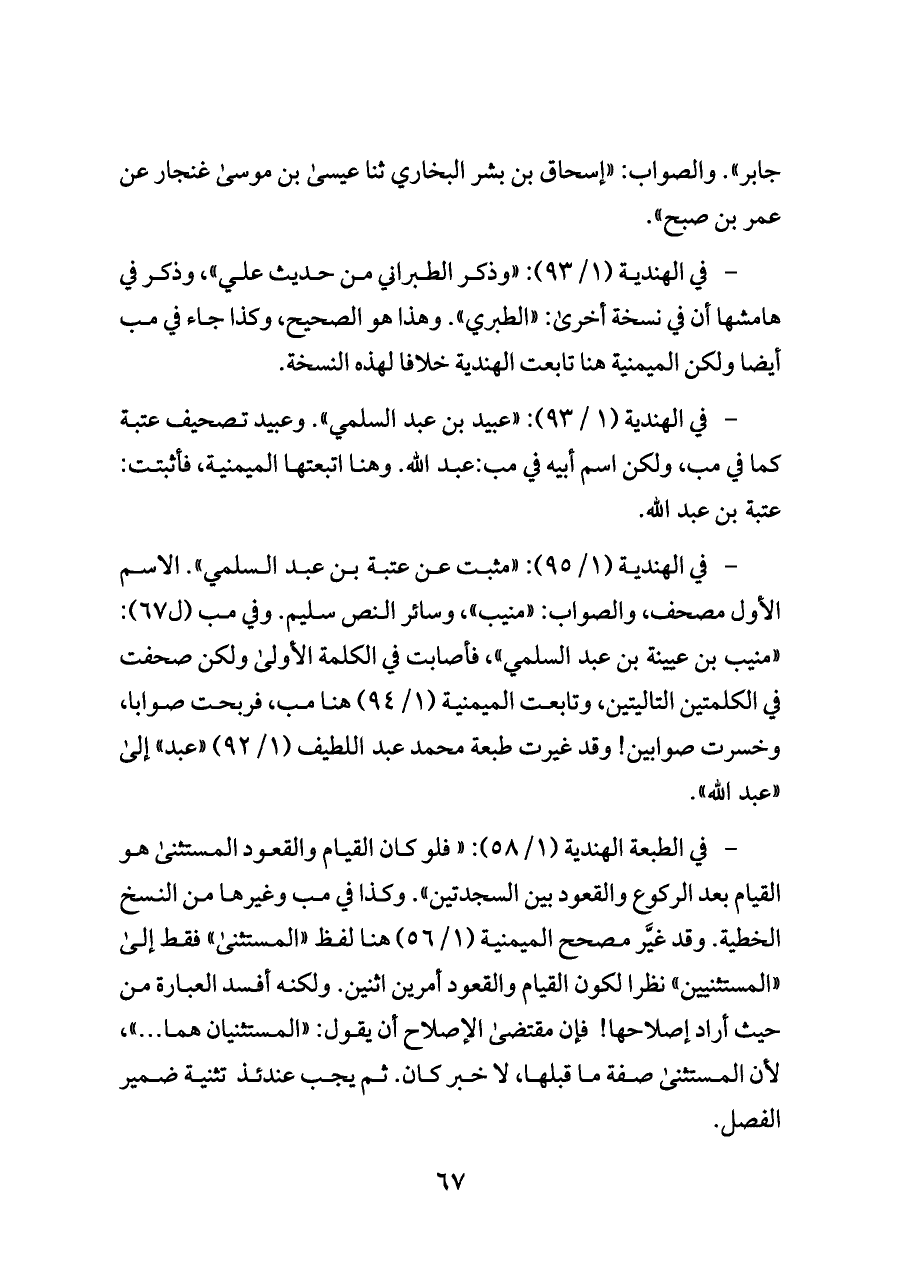 - في الهندية (١/ ٩٥): «مثبت عن عتبة بن عبد السلمي». الاسم الأول مصحف، والصواب: «منيب»، وسائر النص سليم. وفي مب (ل ٦٧): «منيب بن عيينة بن عبد السلمي»، فأصابت في الكلمة الأولى ولكن صحفت في الكلمتين التاليتين، وتابعت الميمنية (١/ ٩٤) هنا مب، فربحت صوابا، وخسرت صوابين! وقد غيرت طبعة محمد عبد اللطيف (١/ ٩٢) «عبد» إلى «عبد الله».