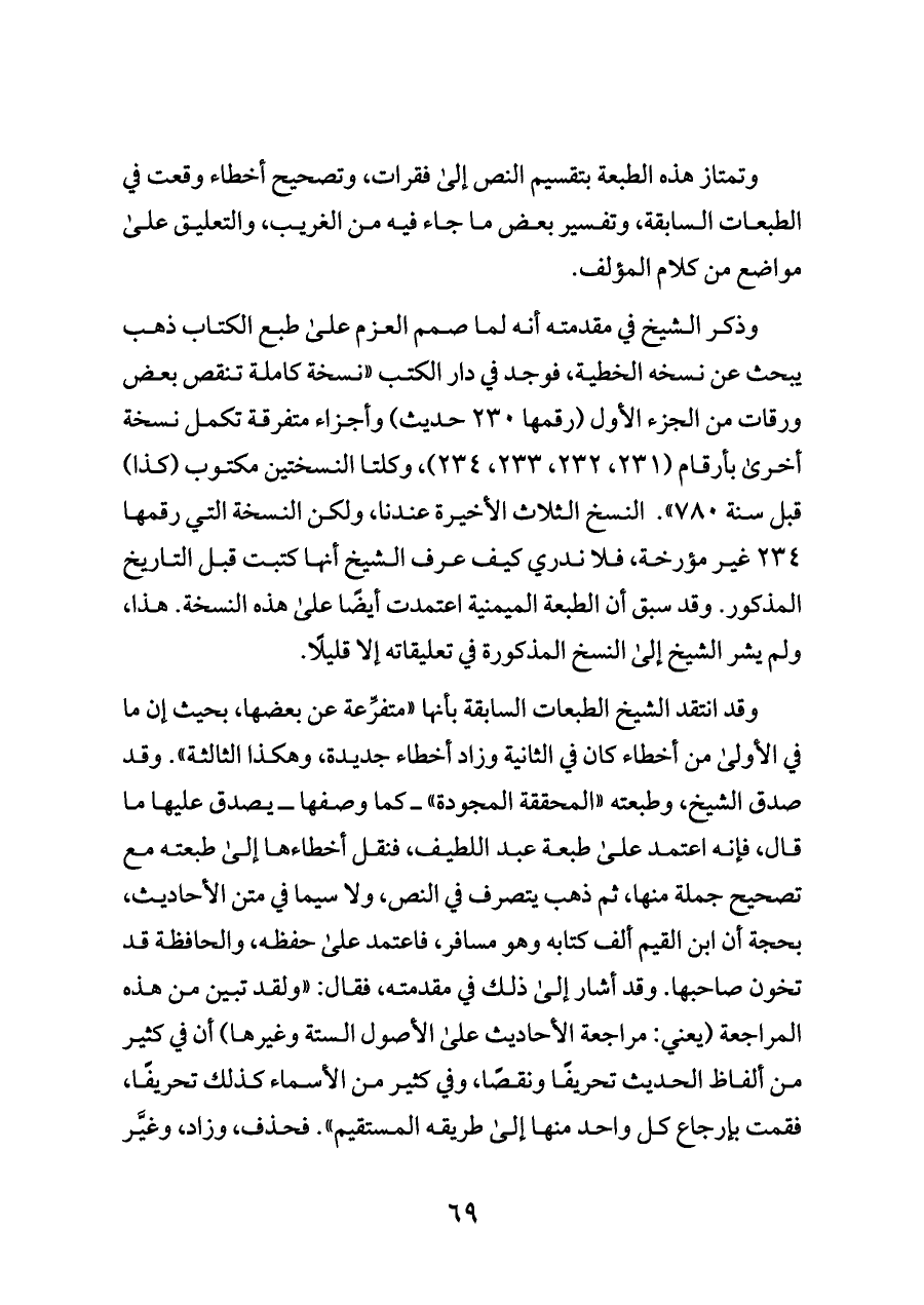 وقد انتقد الشيخ الطبعات السابقة بأنها «متفرِّعة عن بعضها، بحيث إن ما في الأولى من أخطاء كان في الثانية وزاد أخطاء جديدة، وهكذا الثالثة». وقد صدق الشيخ، وطبعته «المحققة المجودة» ــ كما وصفها ــ يصدق عليها ما قال، فإنه اعتمد على طبعة عبد اللطيف، فنقل أخطاءها إلى طبعته مع تصحيح جملة منها، ثم ذهب يتصرف في النص، ولا سيما في متن الأحاديث، بحجة أن ابن القيم ألف كتابه وهو مسافر، فاعتمد على حفظه، والحافظة قد تخون صاحبها. وقد أشار إلى ذلك في مقدمته، فقال: «ولقد تبين من هذه المراجعة (يعني: مراجعة الأحاديث على الأصول الستة وغيرها) أن في كثير من ألفاظ الحديث تحريفًا ونقصًا، وفي كثير من الأسماء كذلك تحريفًا، فقمت بإرجاع كل واحد منها إلى طريقه المستقيم». فحذف، وزاد، وغيَّر